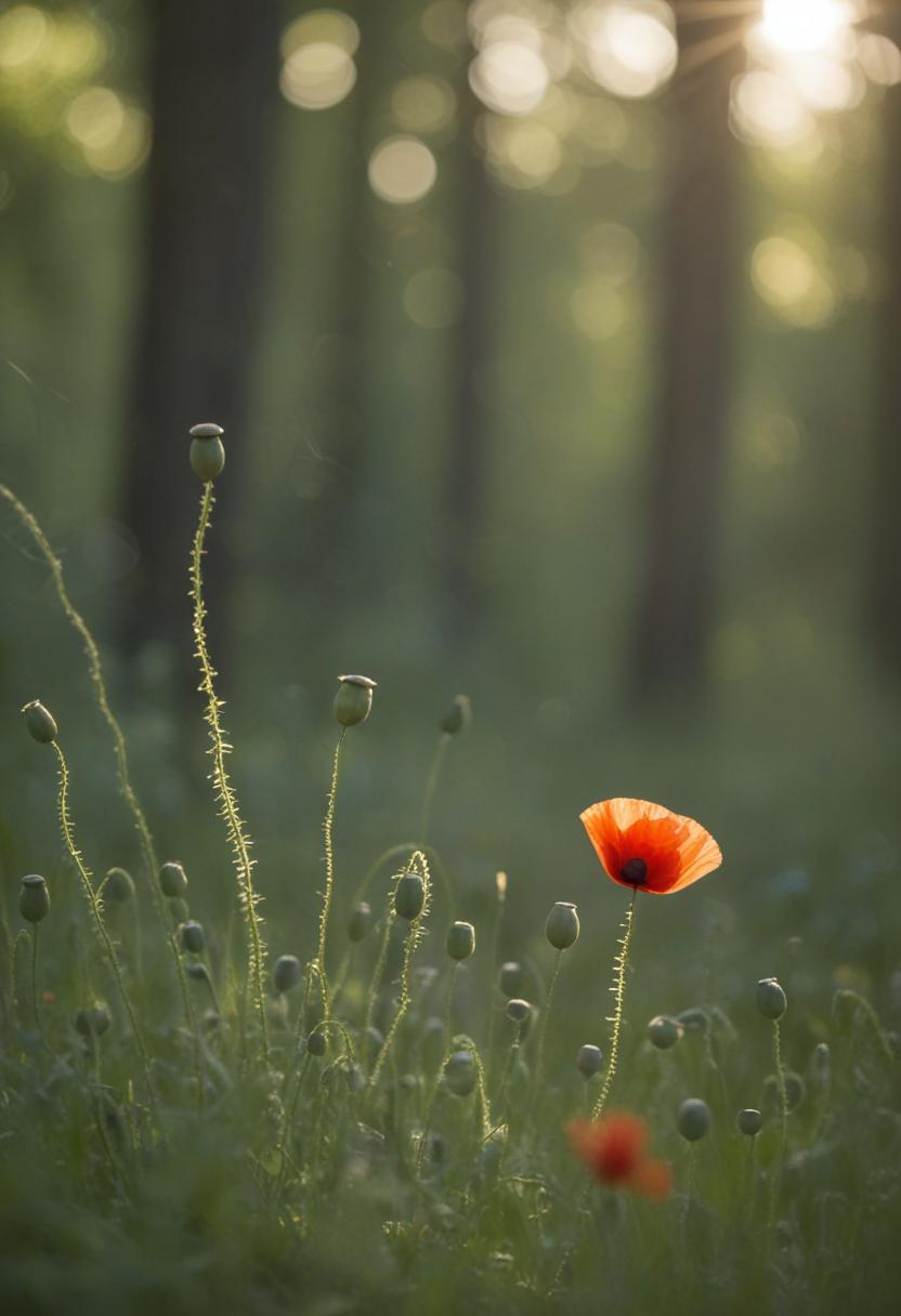 82. A soft glow filters through a dappled forest, casting gentle light on a poppy aesthetic scene. The side view highlights the delicate beauty of the flora under natural light.