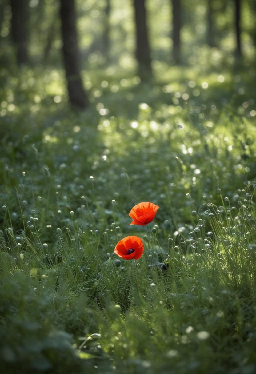 77. A serene top-down view of a dappled forest under soft light, surrounded by poppy blooms, evoking a calm and peaceful poppy aesthetic.