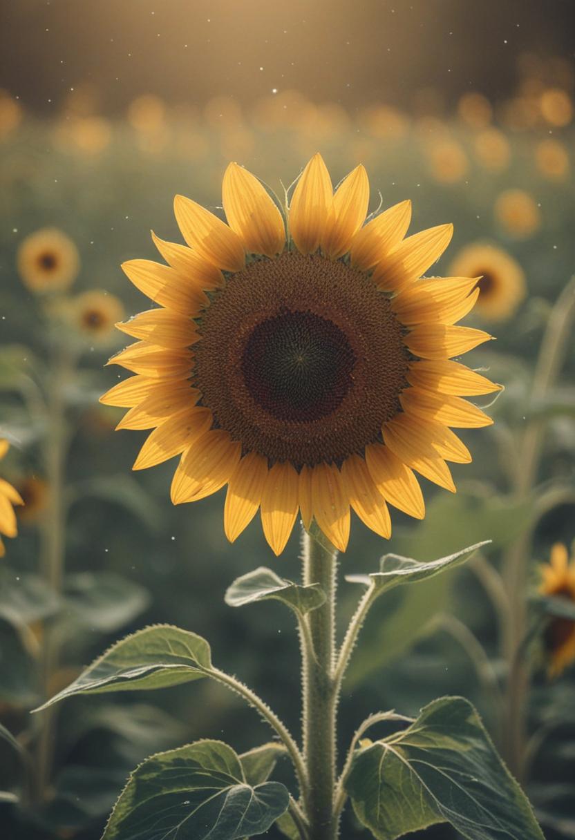 75. A sunflower bathes in soft morning light, viewed from above with a mysterious, ethereal glow.