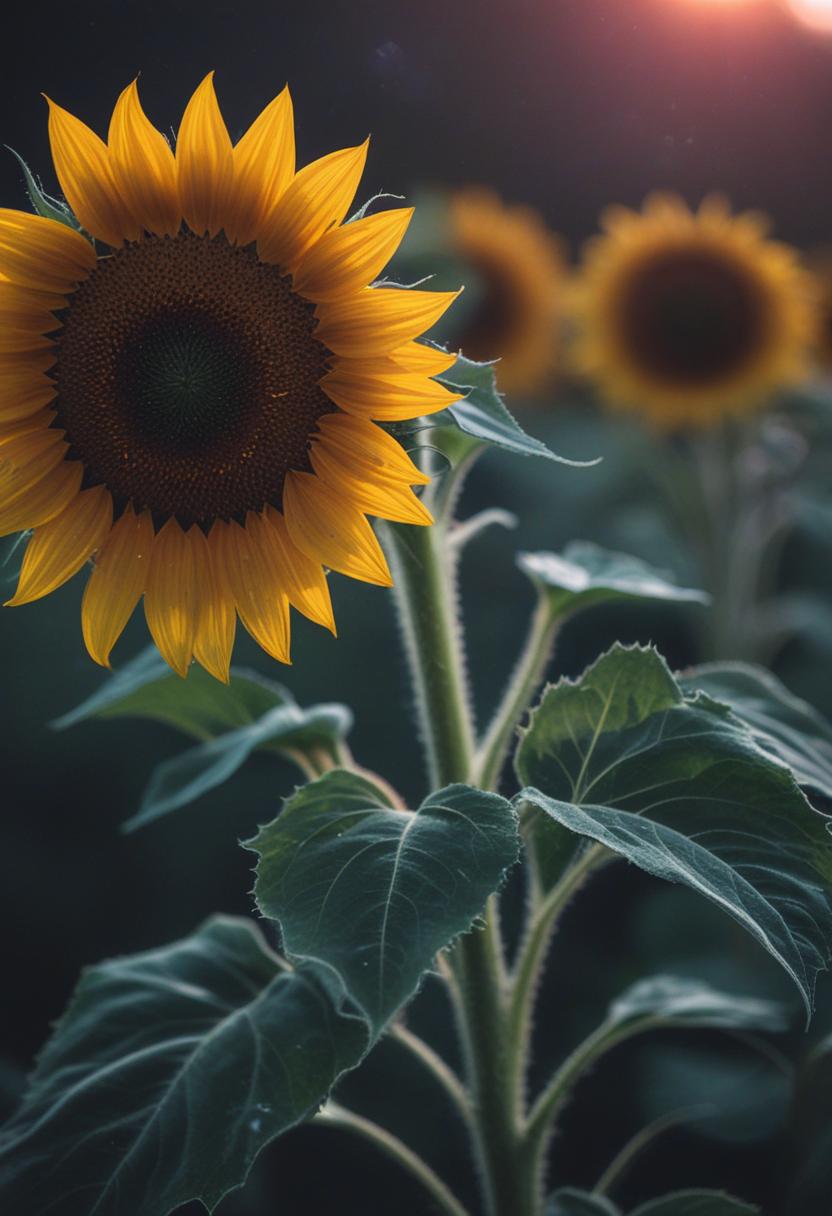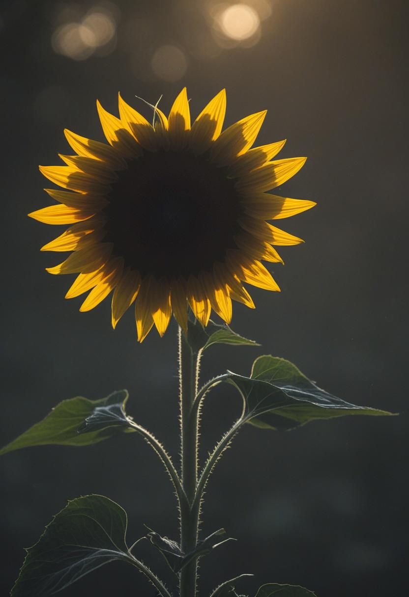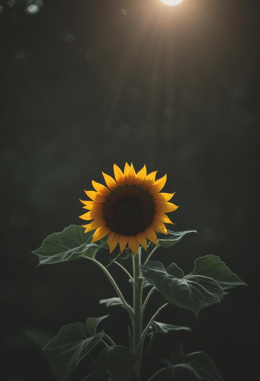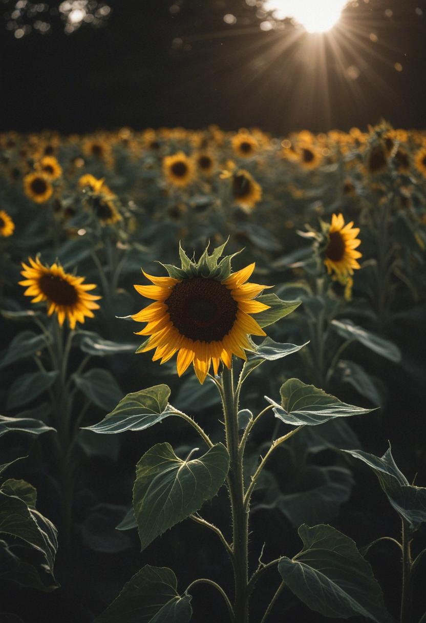 56. A dramatic wide-angle shot of a sunflower under moody, backlighting, exuding a sunflower aesthetic with deep shadows and soft light.