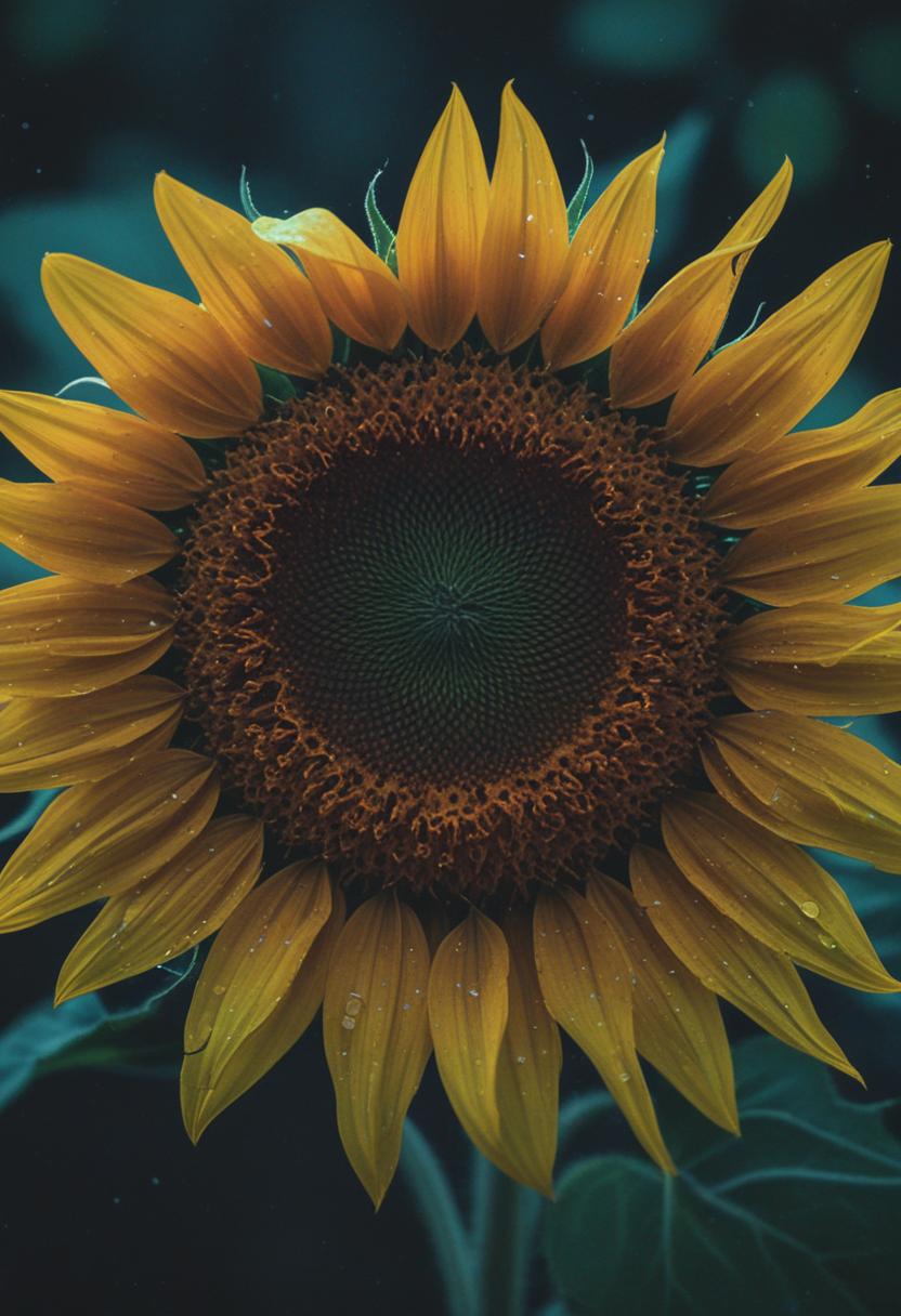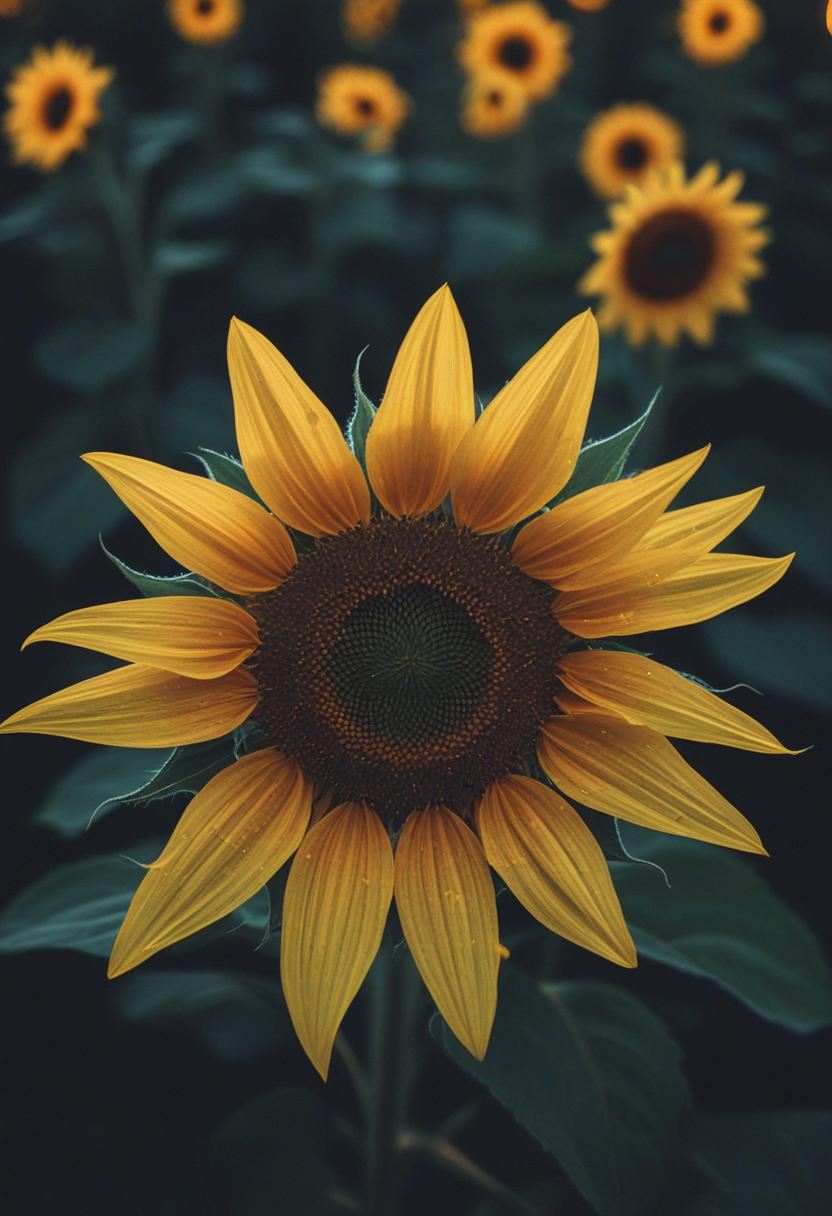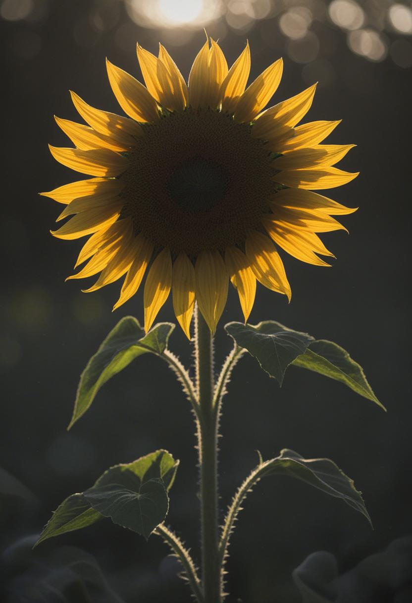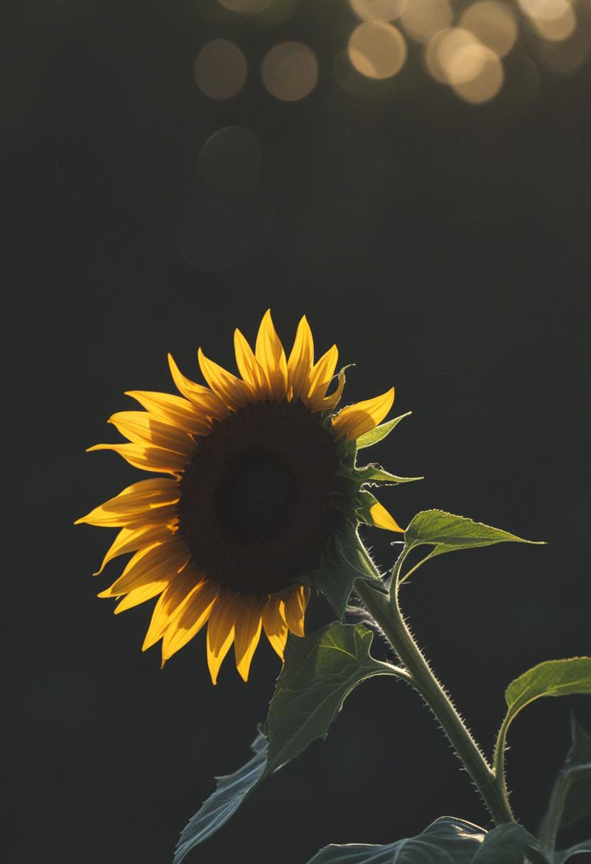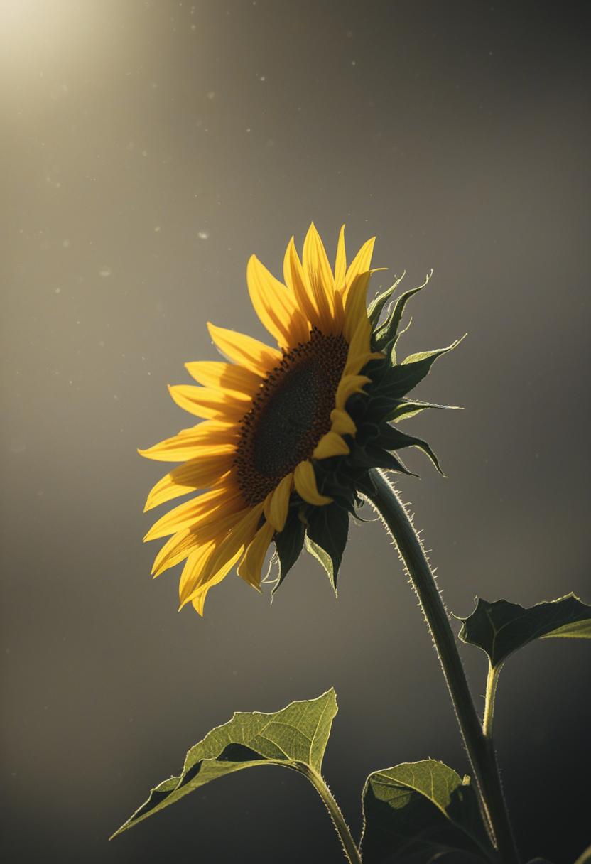 56. A dramatic wide-angle shot of a sunflower under moody, backlighting, exuding a sunflower aesthetic with deep shadows and soft light.