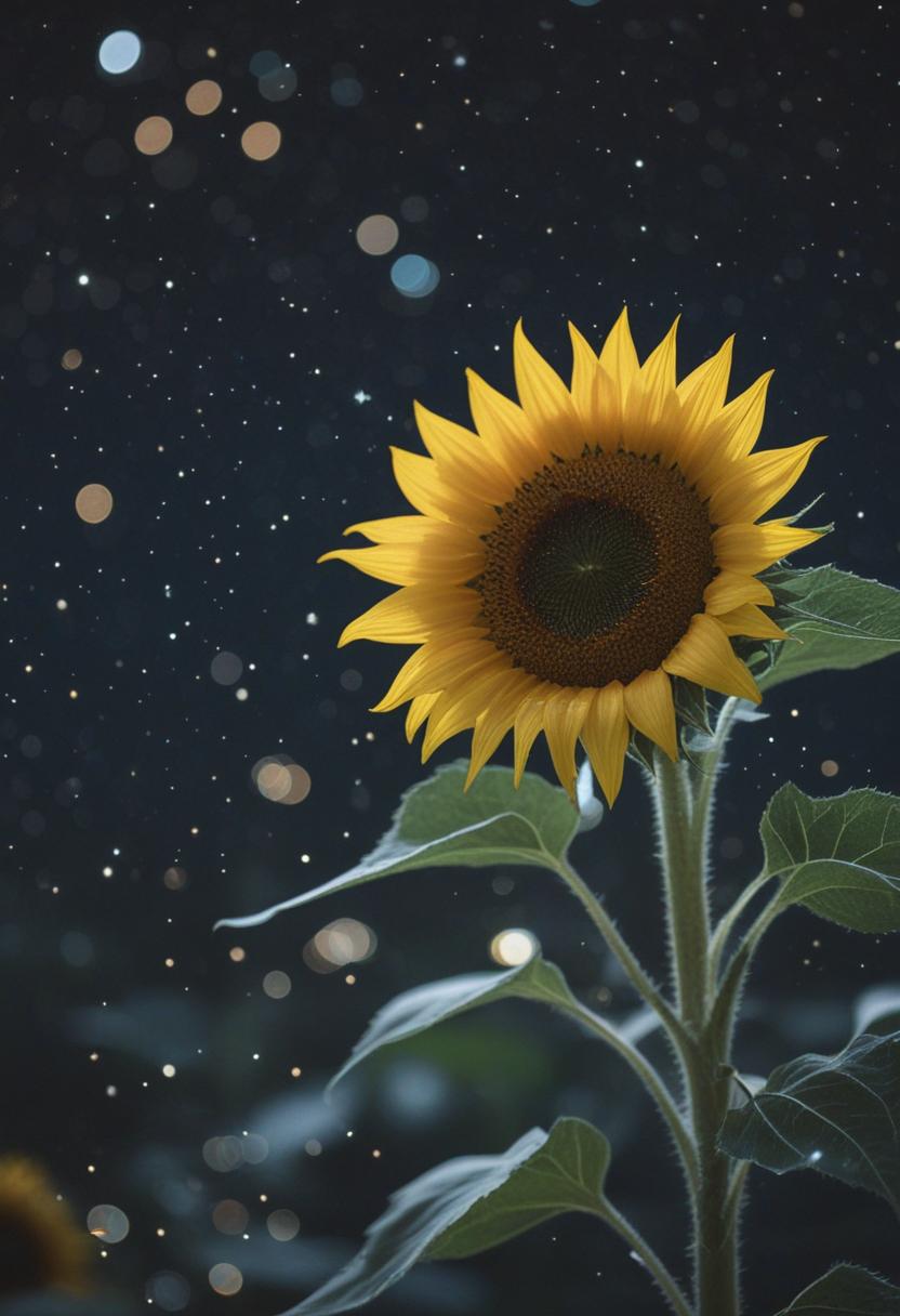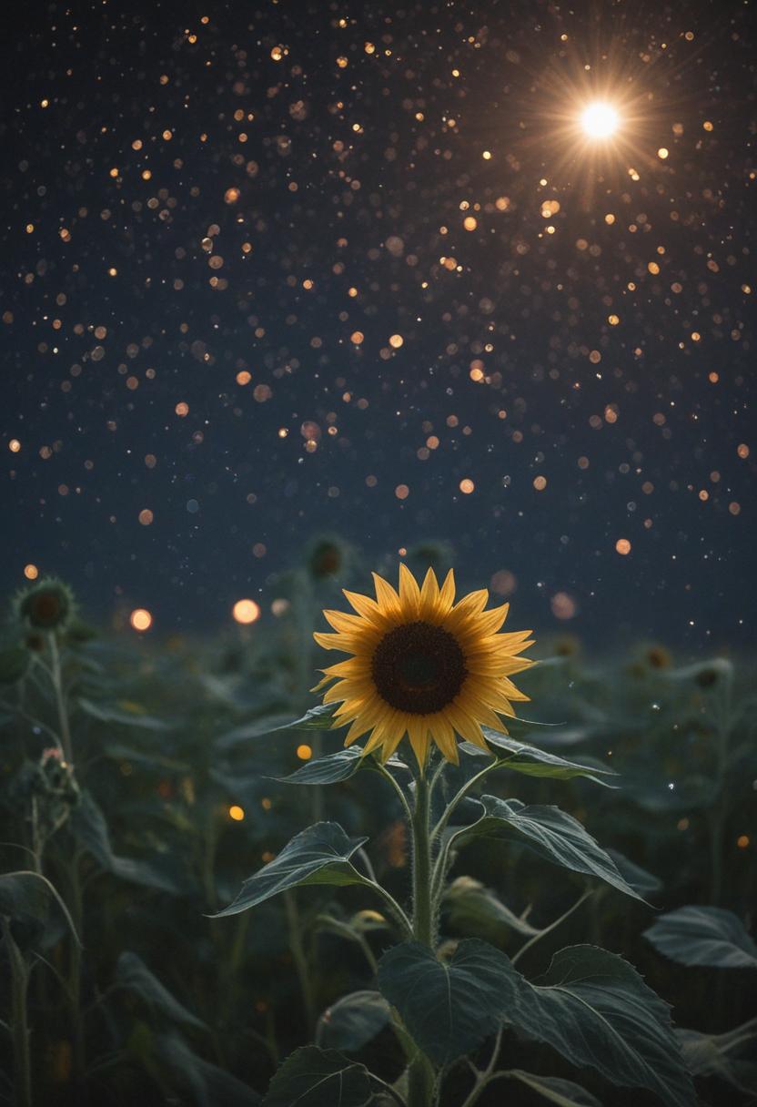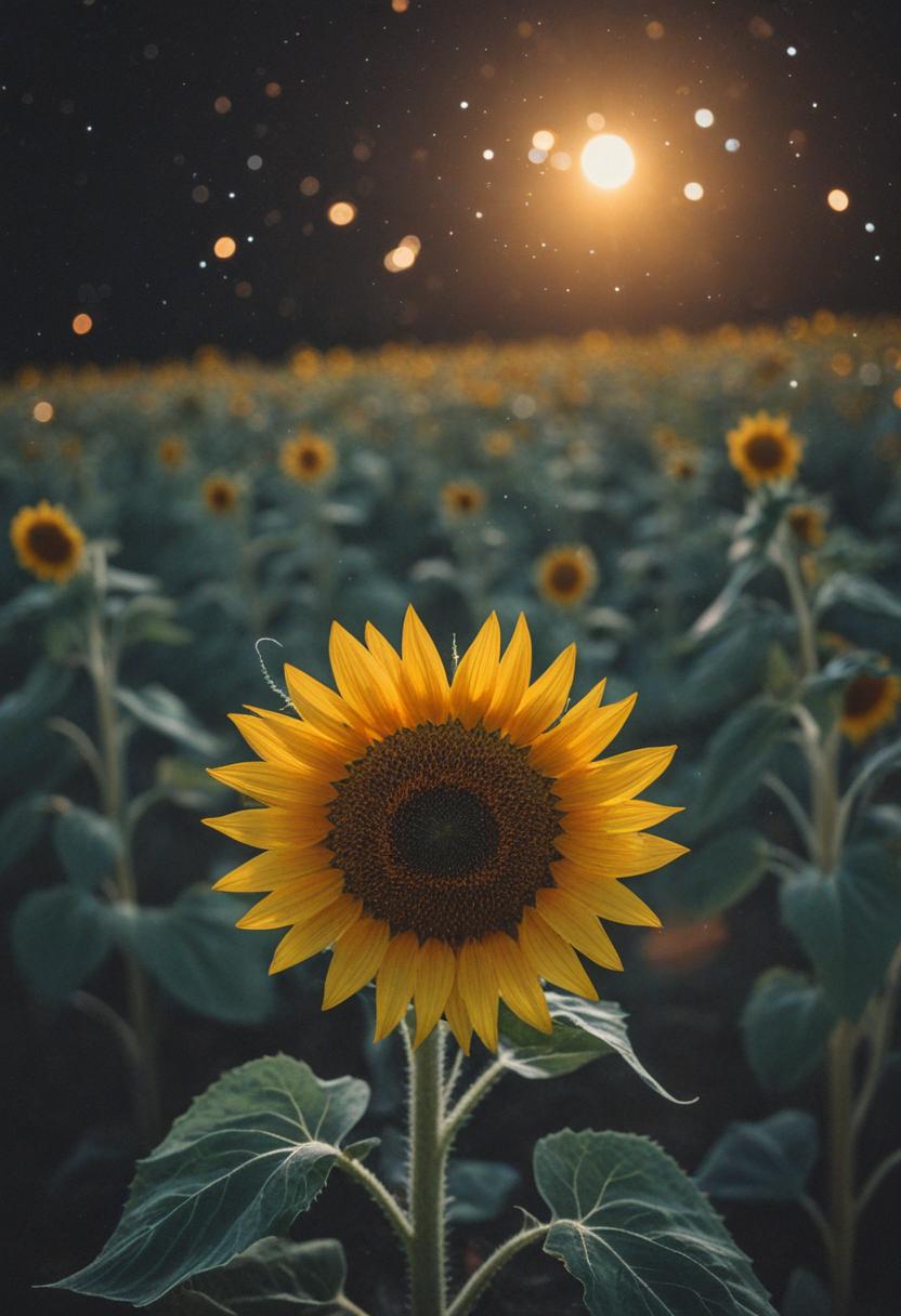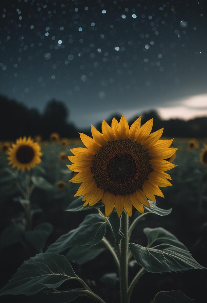 36. A wide-angle shot captures a sunflower under starlit skies, blending sunflower aesthetic with mysterious and ethereal lighting.