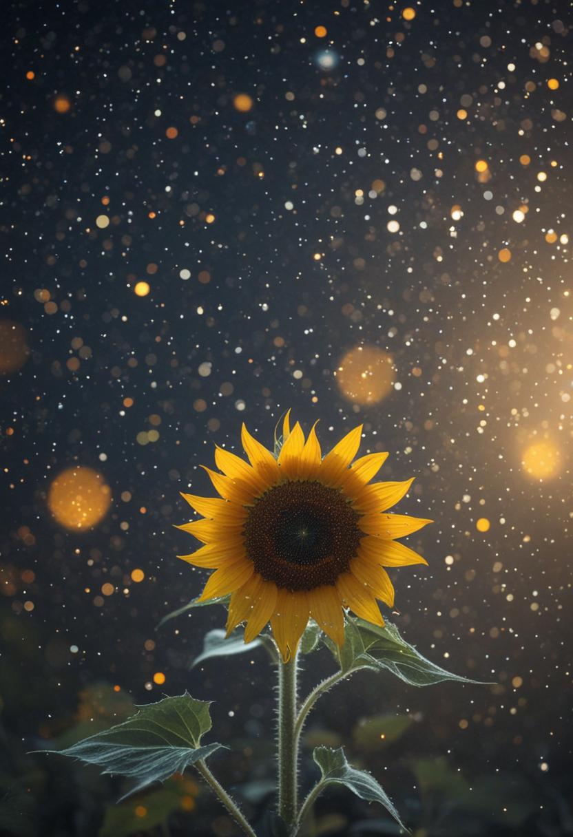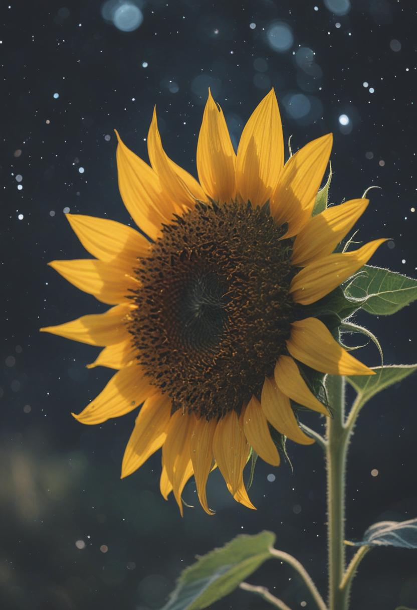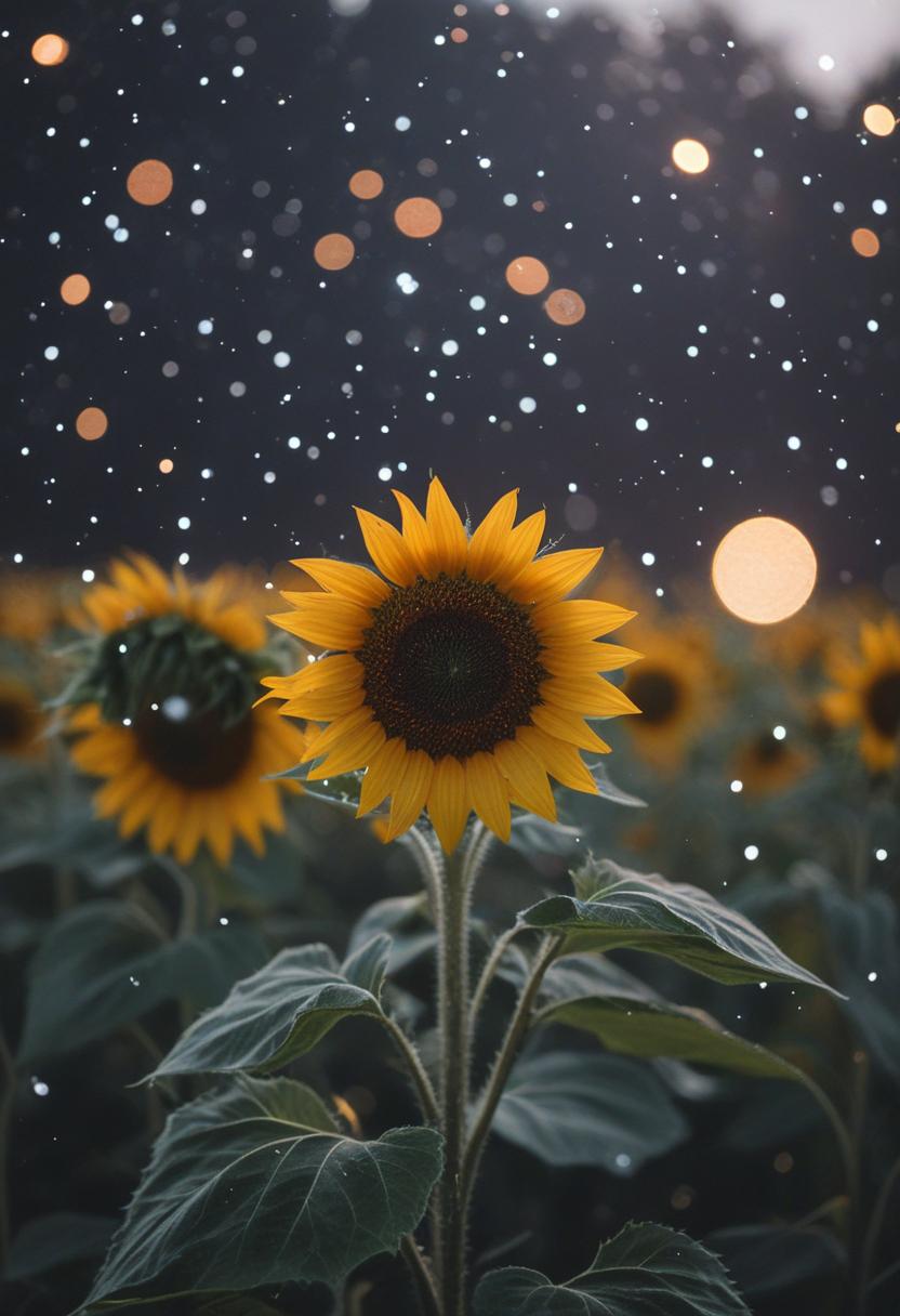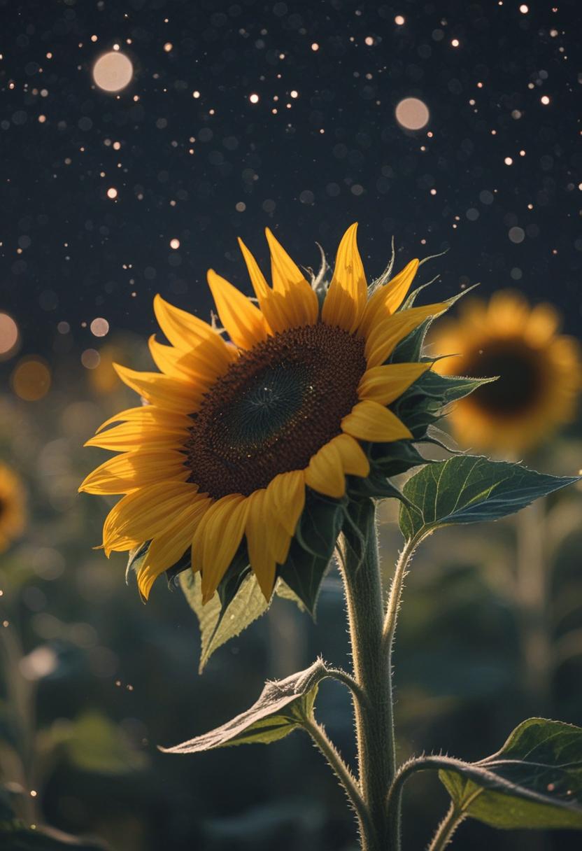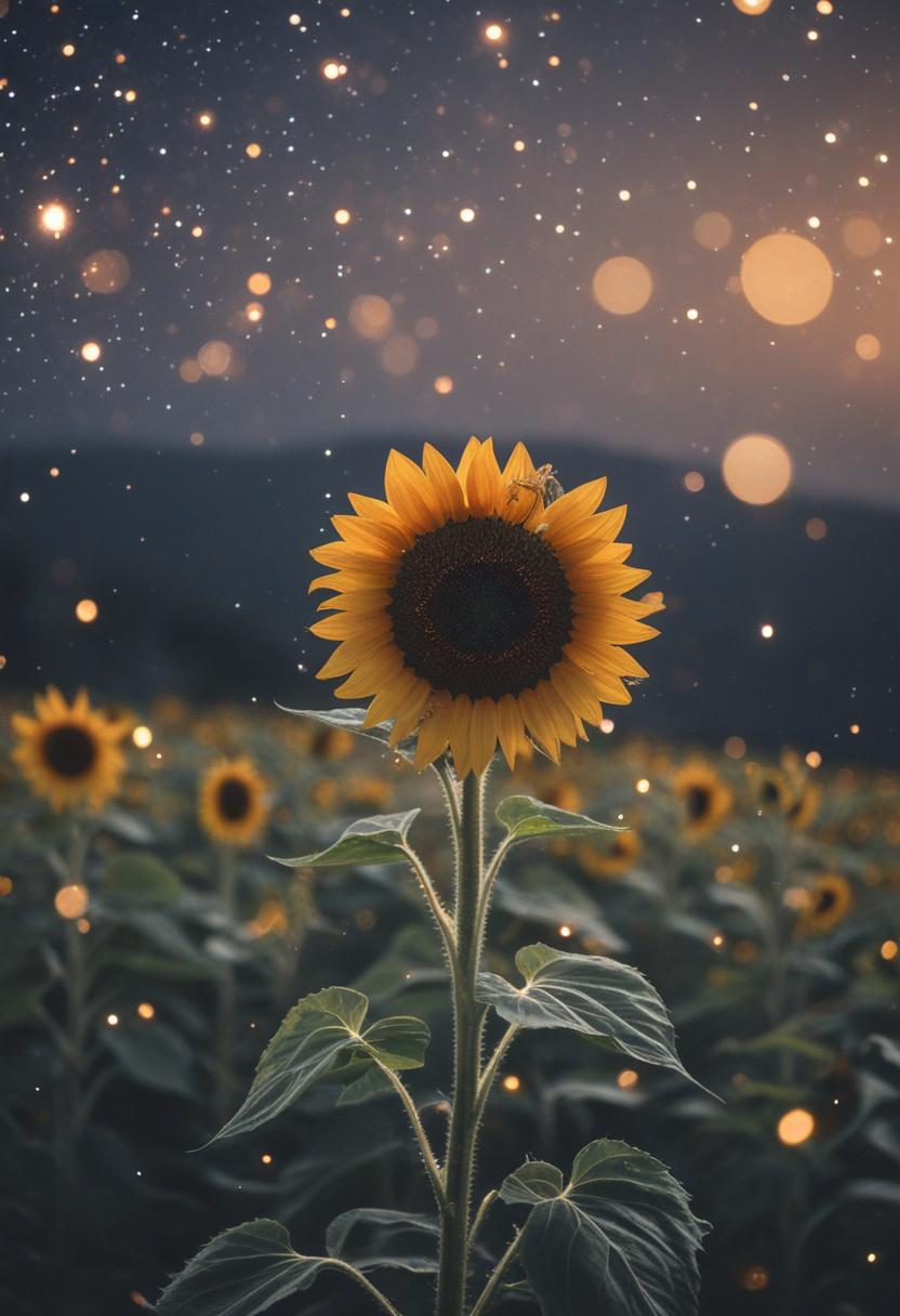 36. A wide-angle shot captures a sunflower under starlit skies, blending sunflower aesthetic with mysterious and ethereal lighting.