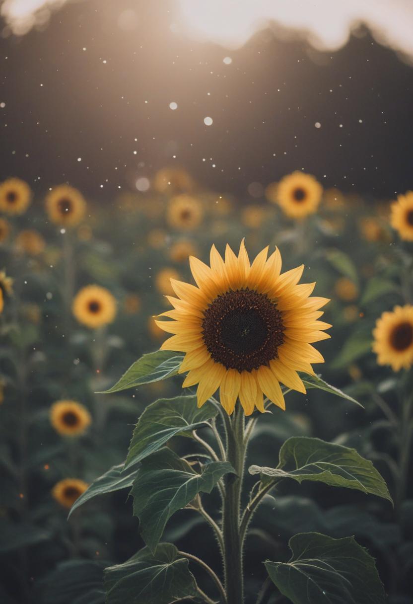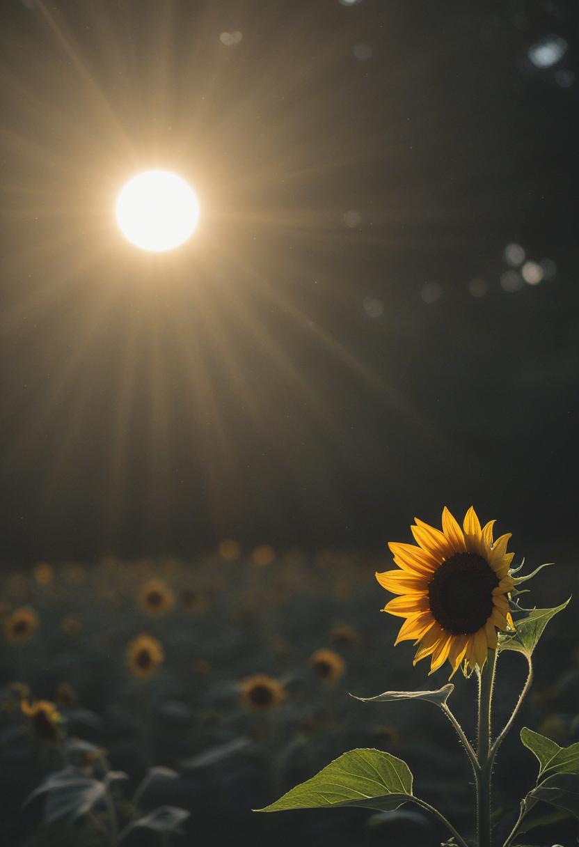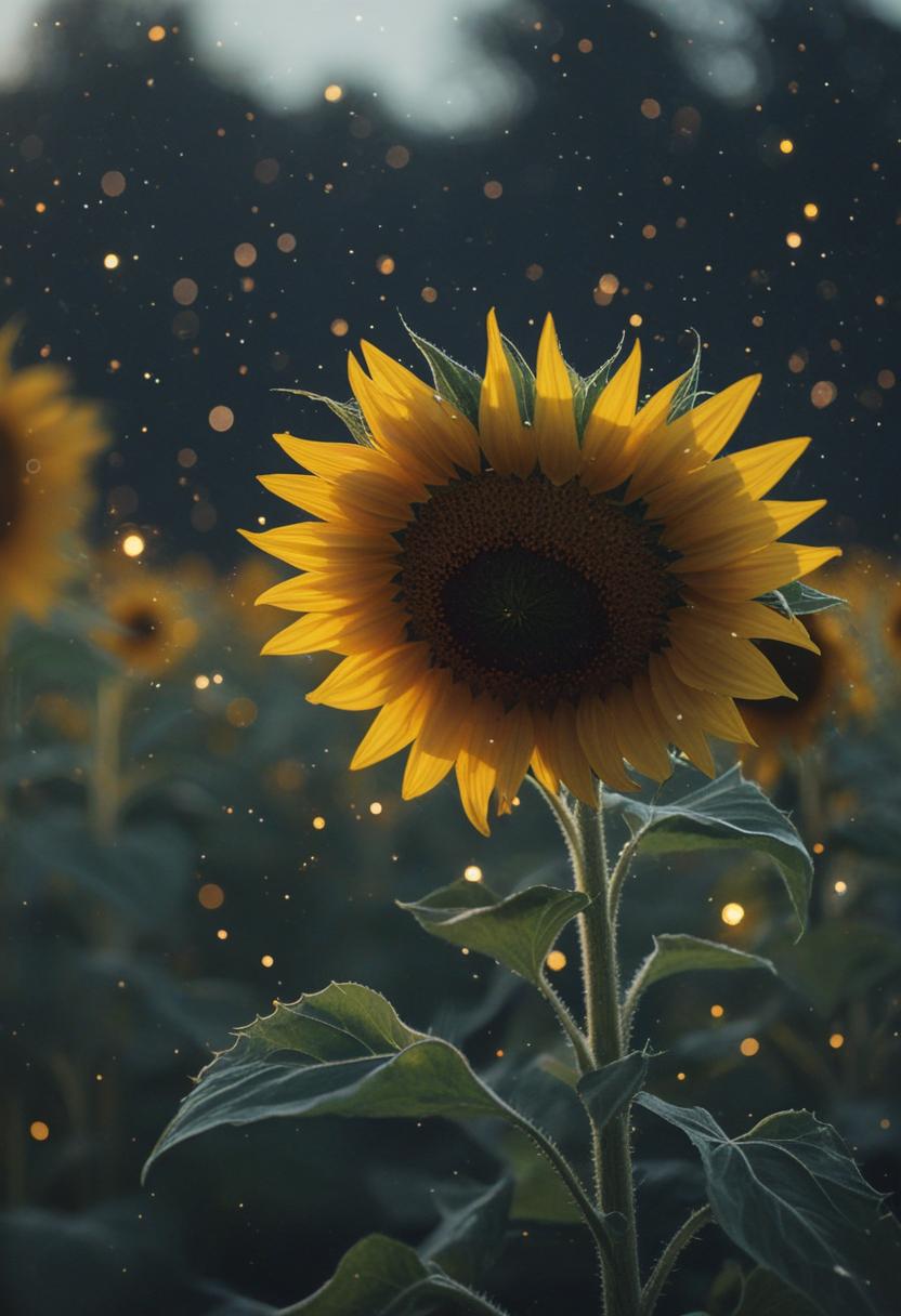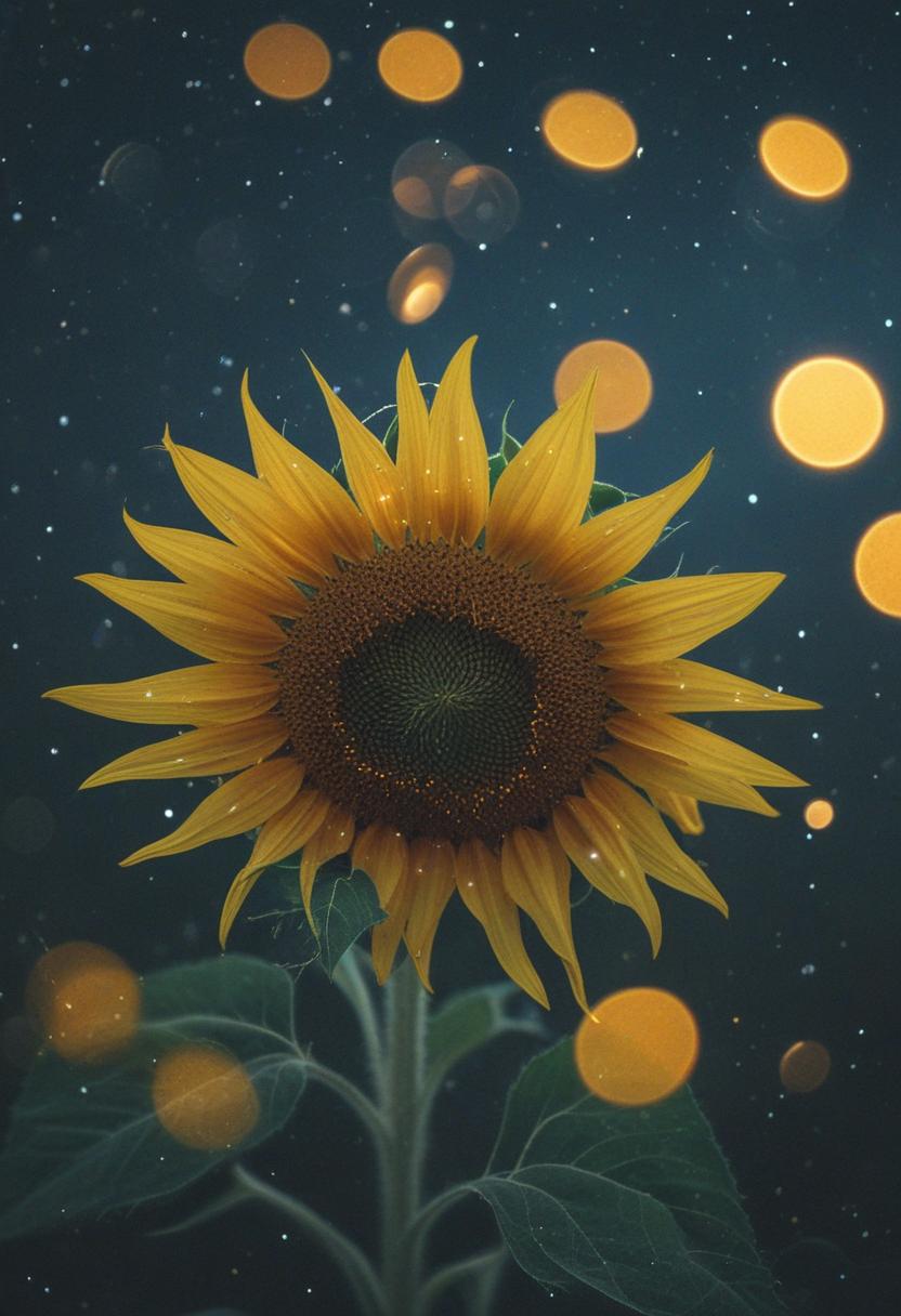 36. A wide-angle shot captures a sunflower under starlit skies, blending sunflower aesthetic with mysterious and ethereal lighting.