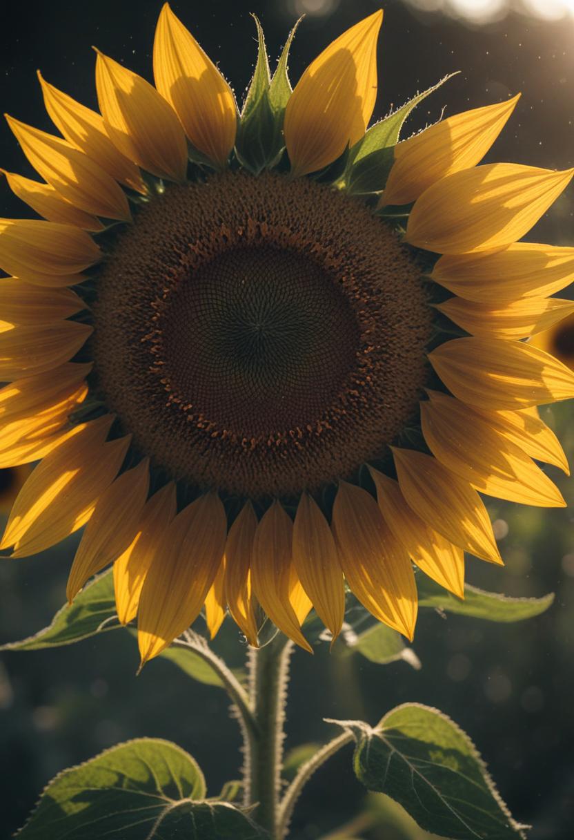39. A sunflower bathed in dramatic backlighting, creating an epic, close-up scene with a vibrant, sunlit aesthetic.