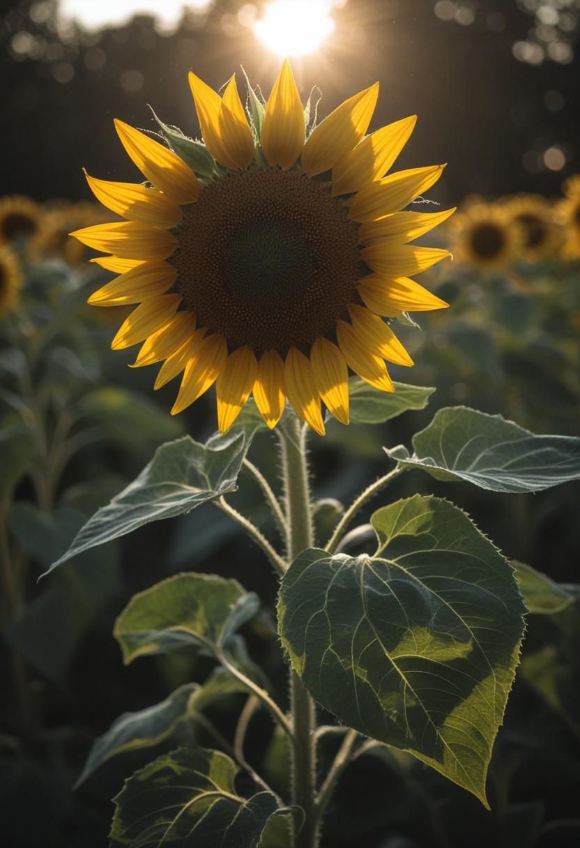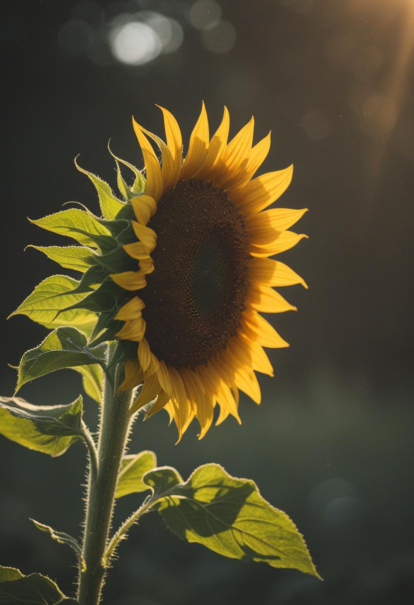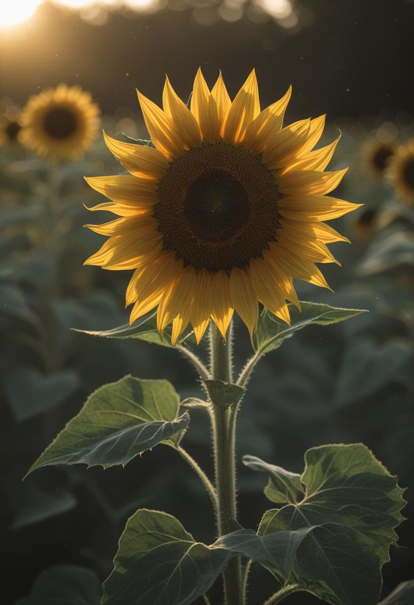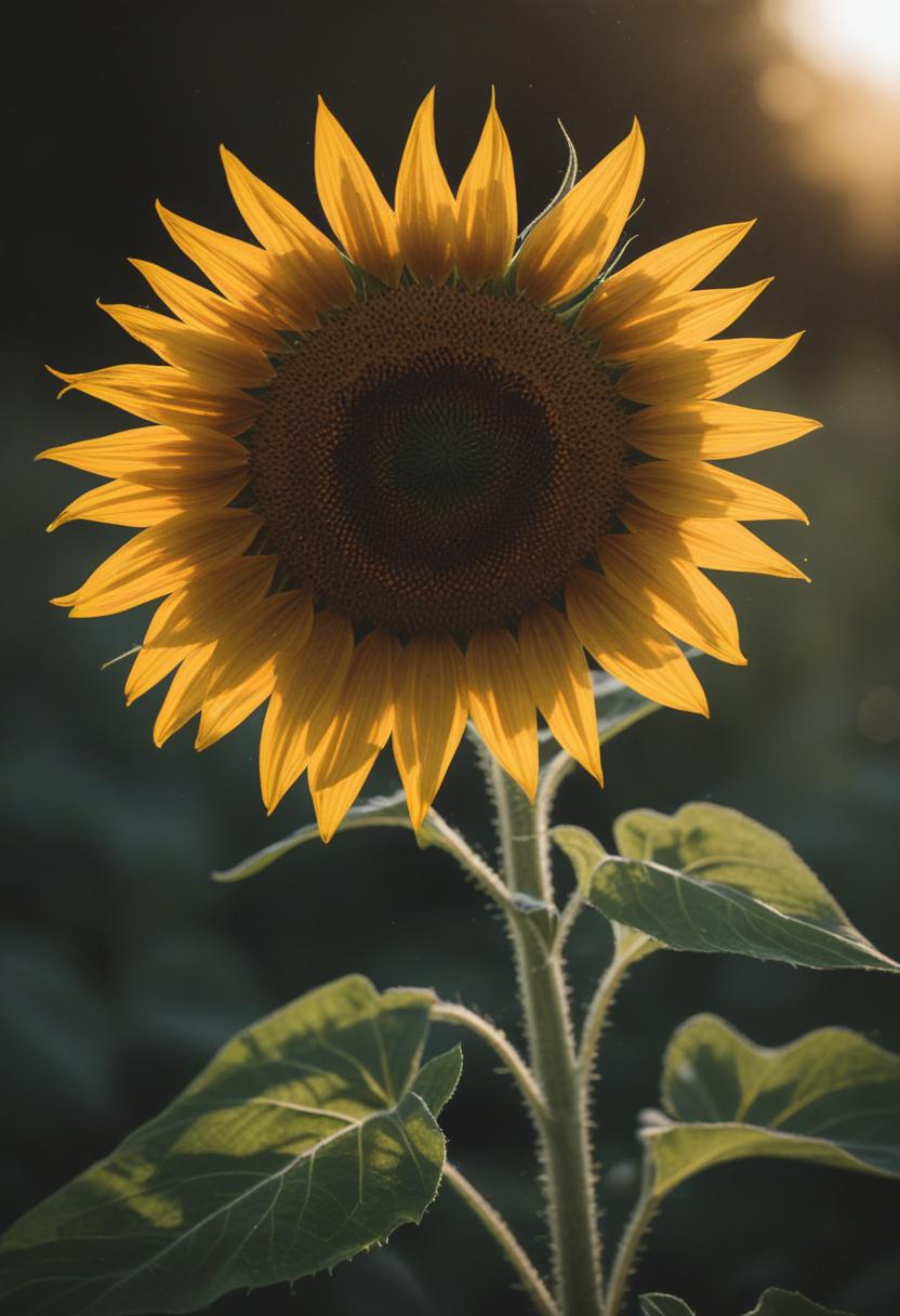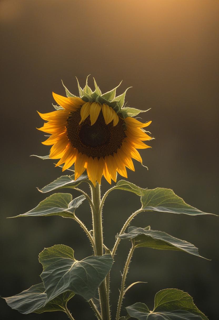 35. A sunflower bathed in soft, dramatic backlighting, casting a warm glow. Midshot captures its vibrant petals against a blurred, dreamy background.