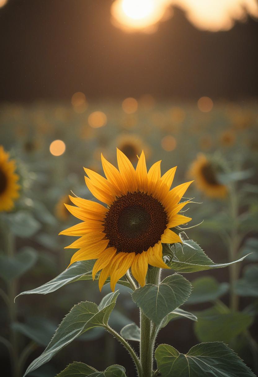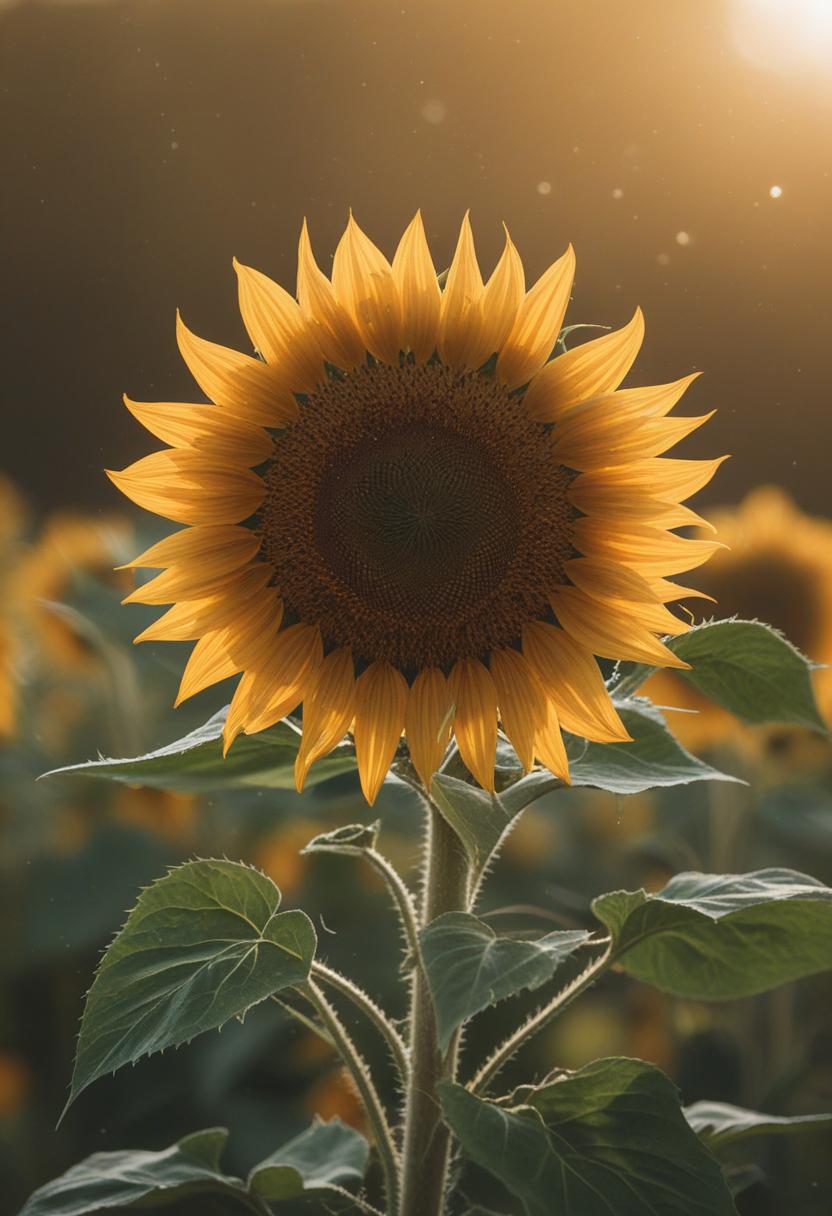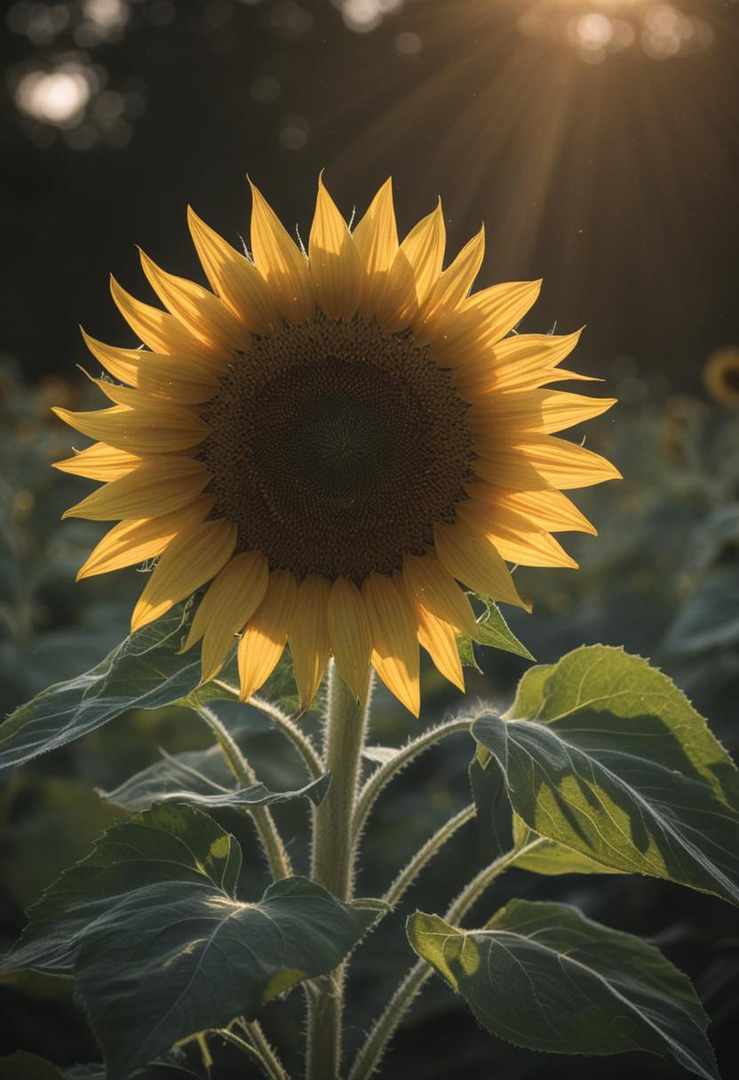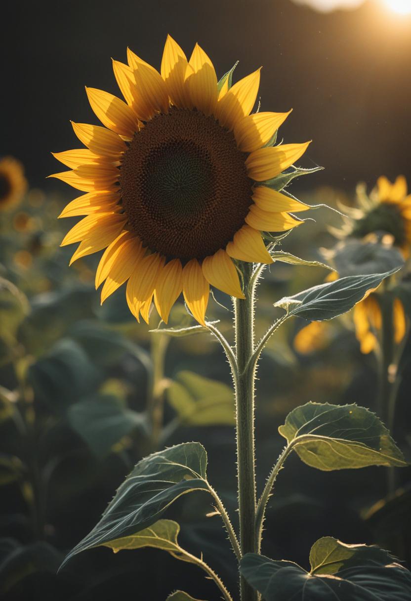 35. A sunflower bathed in soft, dramatic backlighting, casting a warm glow. Midshot captures its vibrant petals against a blurred, dreamy background.
