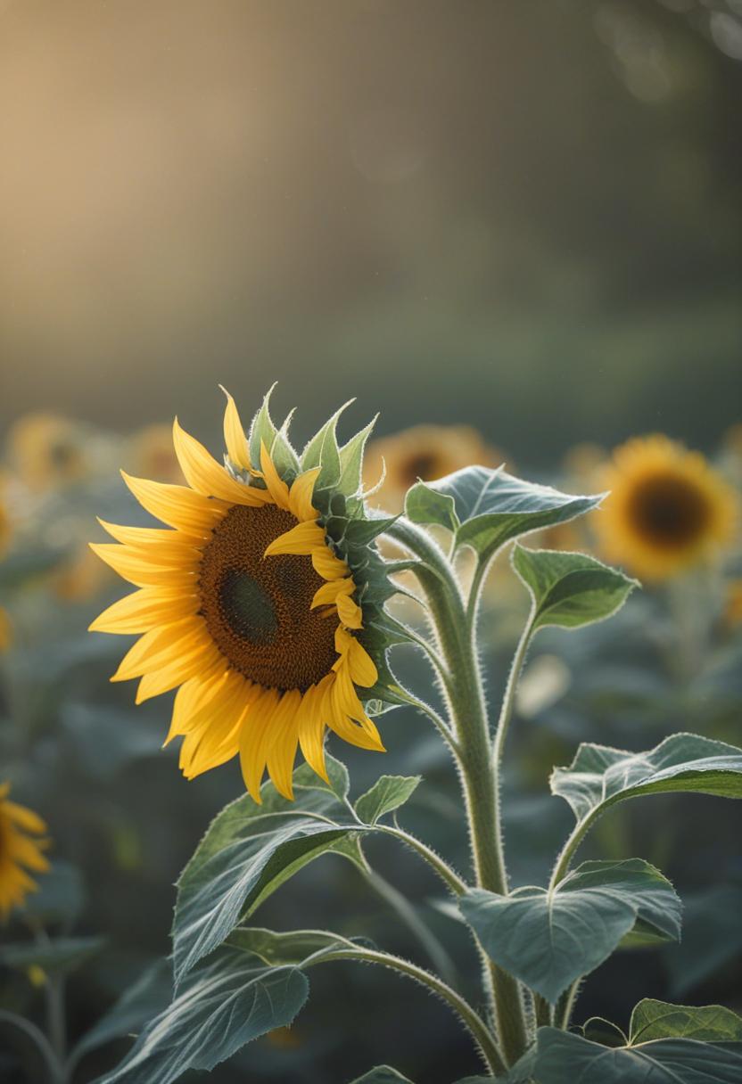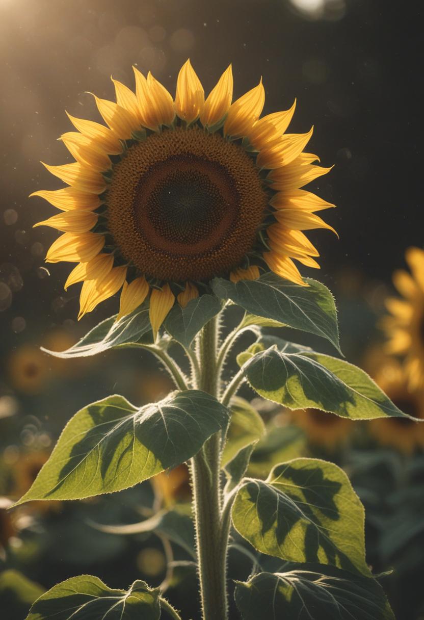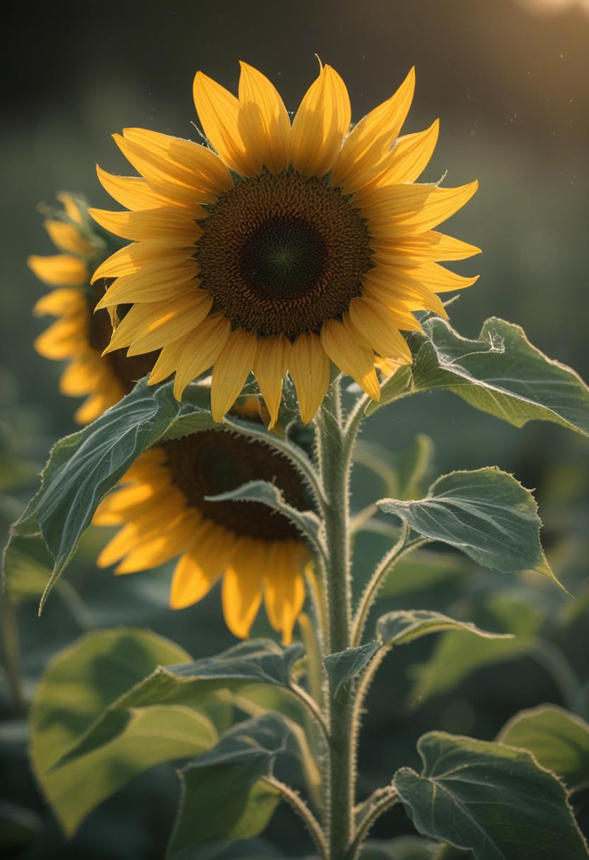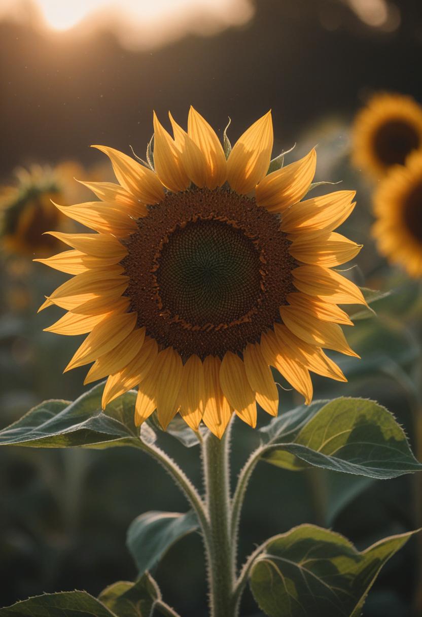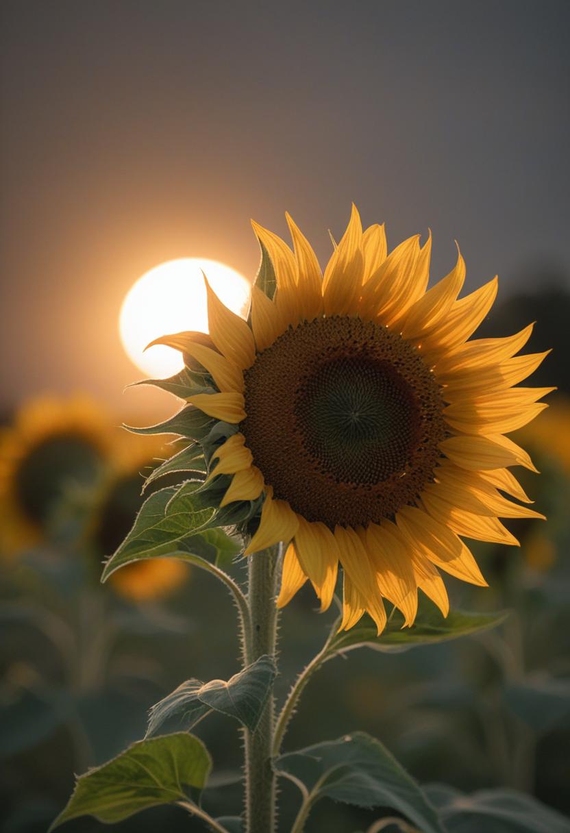 35. A sunflower bathed in soft, dramatic backlighting, casting a warm glow. Midshot captures its vibrant petals against a blurred, dreamy background.