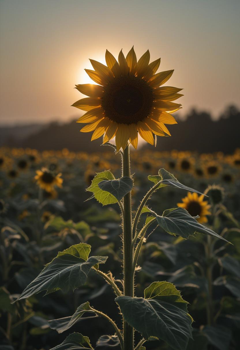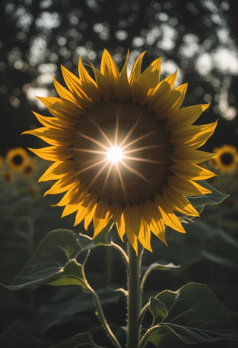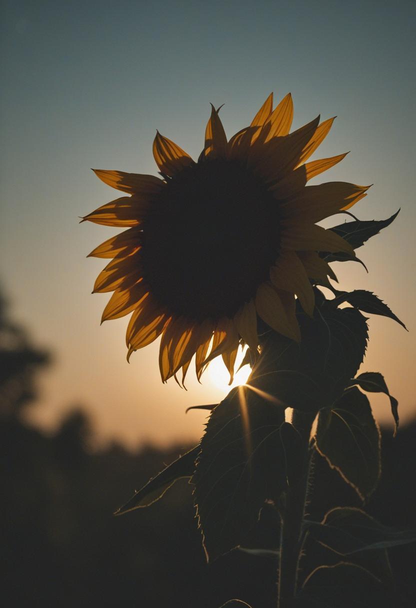 7. A dramatic close-up of a sunflower under a sunset, glowing with warm hues, capturing the beauty of nature and light in a striking, serene moment.