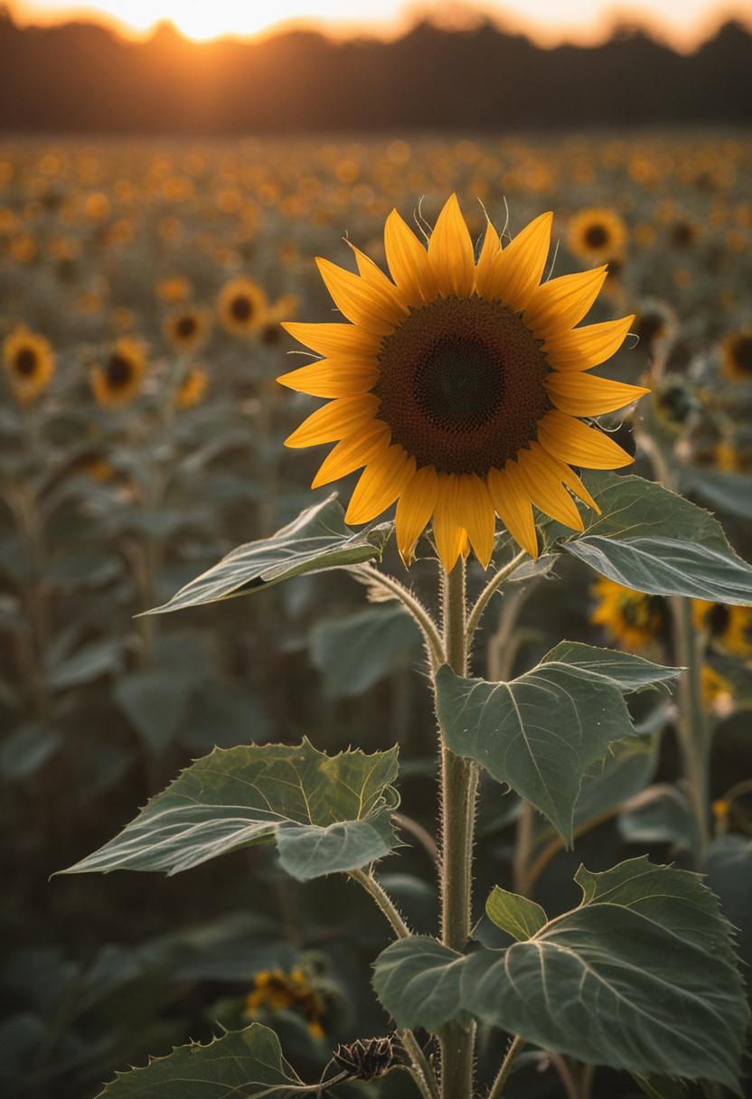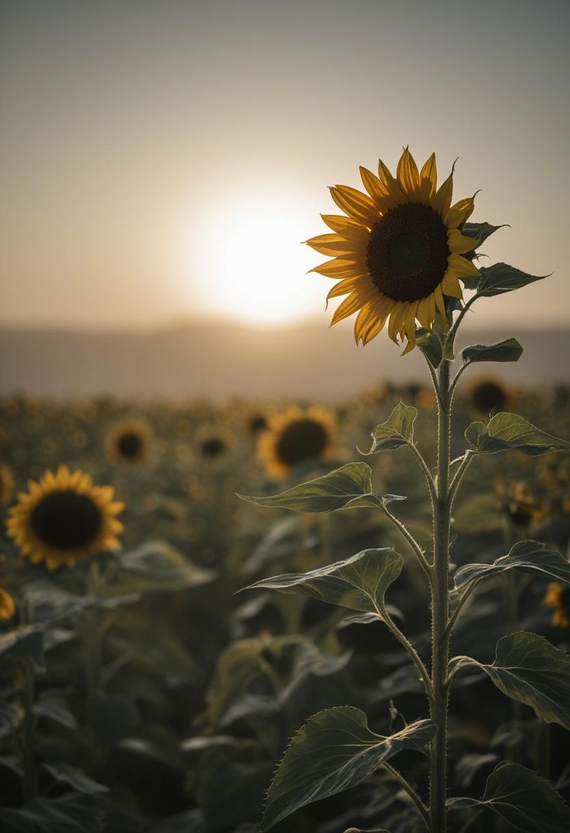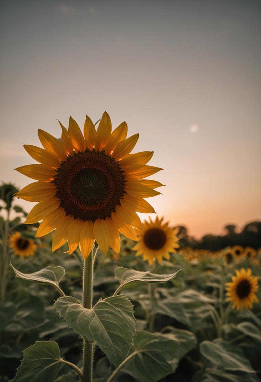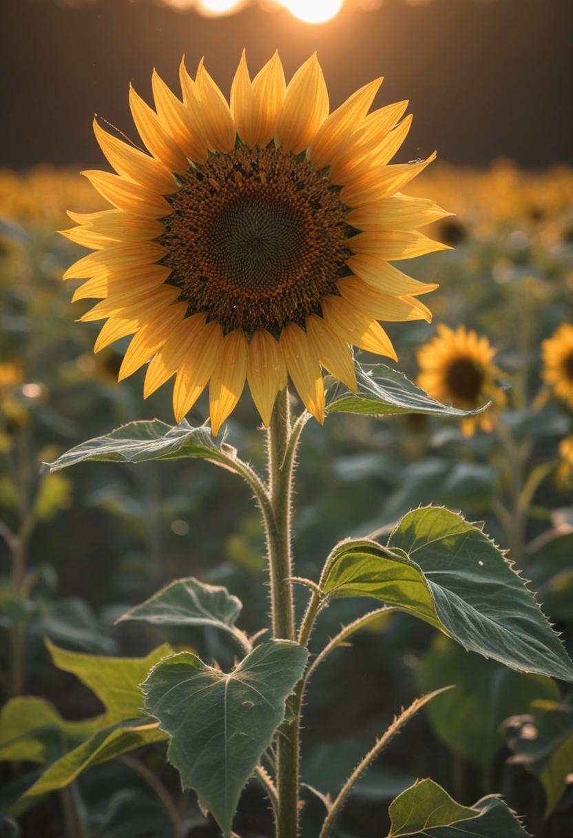 7. A dramatic close-up of a sunflower under a sunset, glowing with warm hues, capturing the beauty of nature and light in a striking, serene moment.