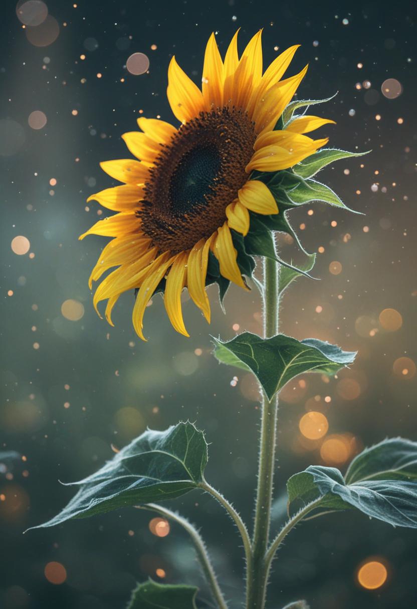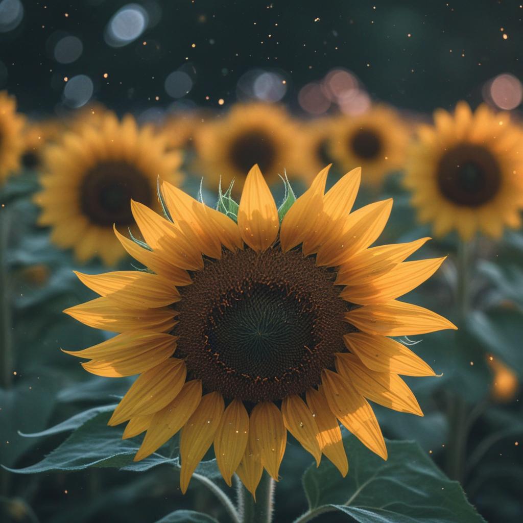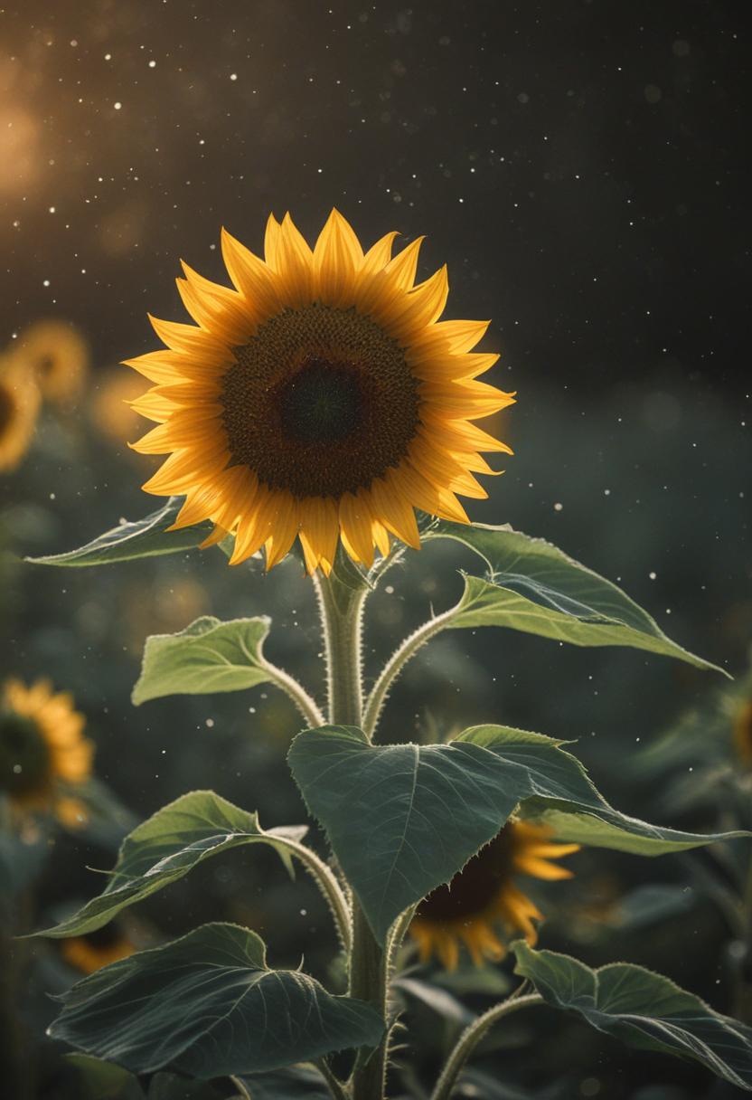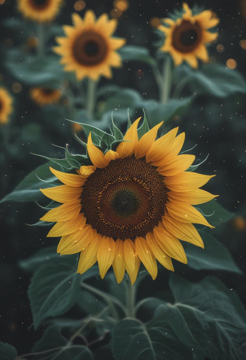 3. A sunflower in a whimsical studio setting, glowing under starlight, blending fantasy and nature with soft, magical lighting.