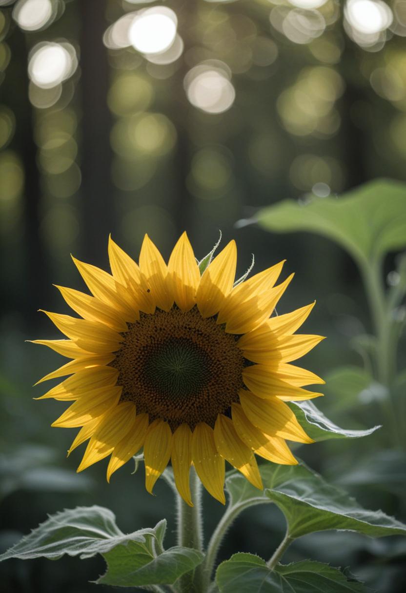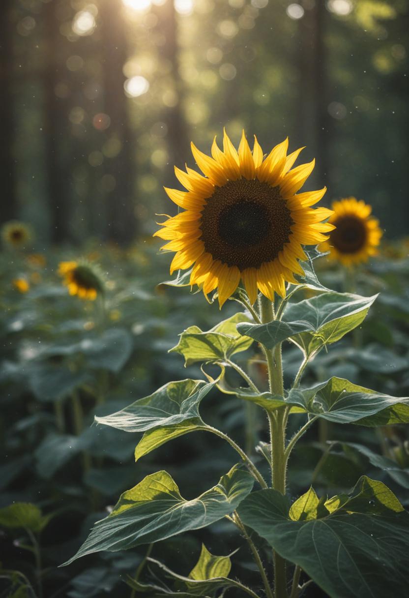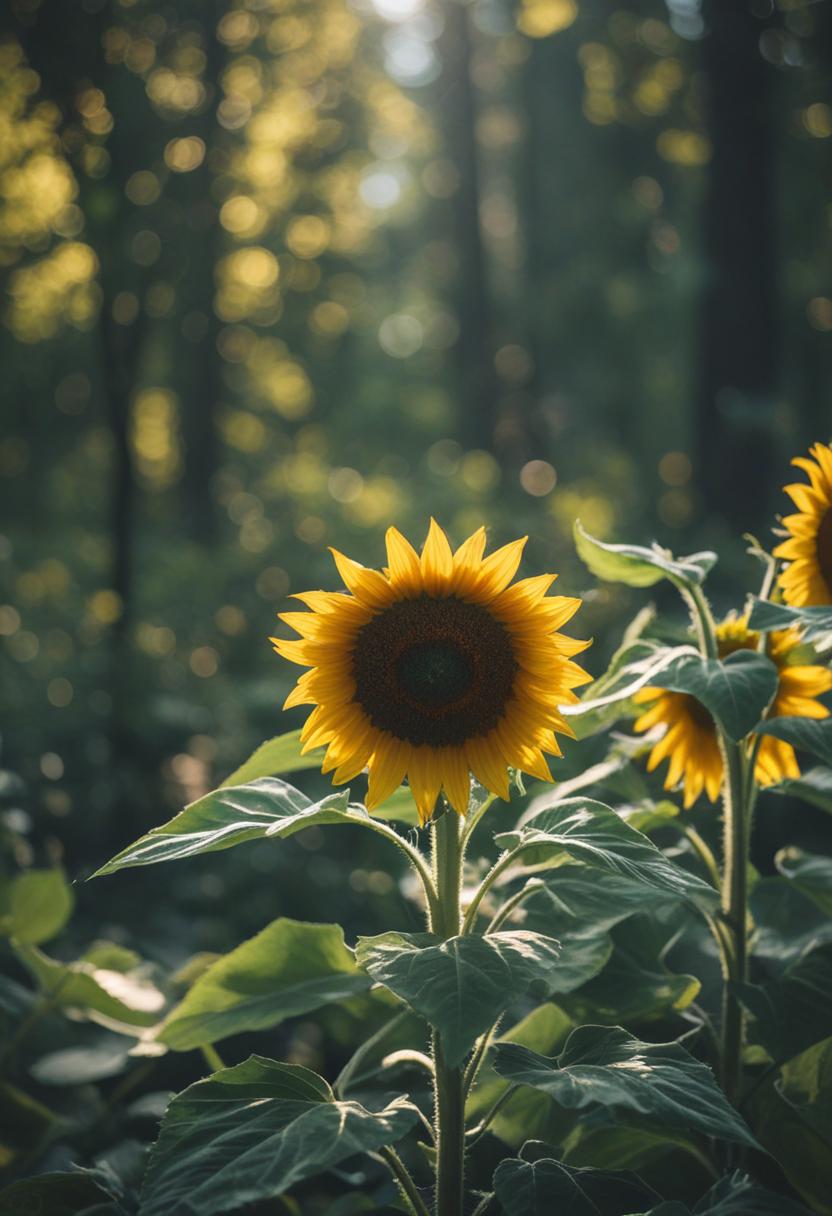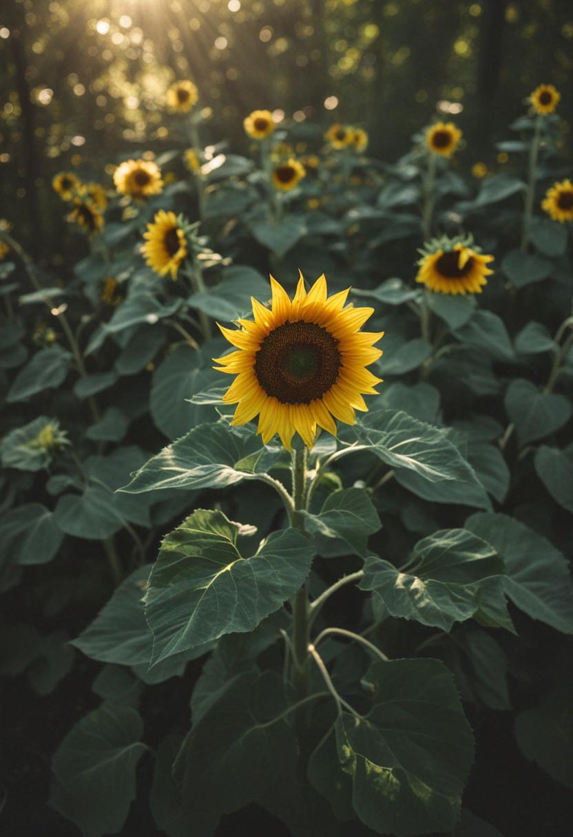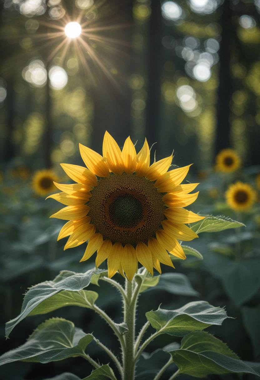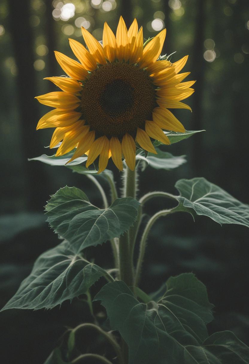 11. A sunflower in a dappled forest light, softly glowing in a studio shot, exuding a warm, serene aesthetic.