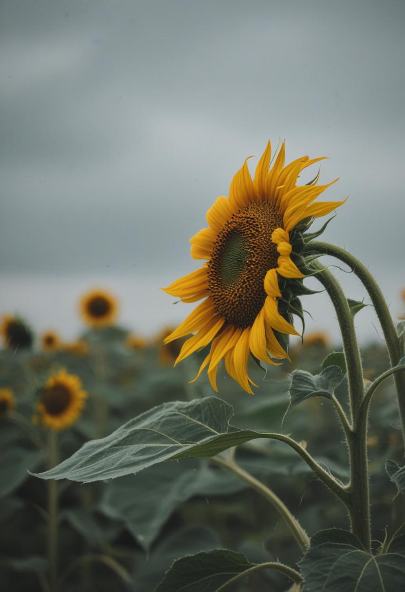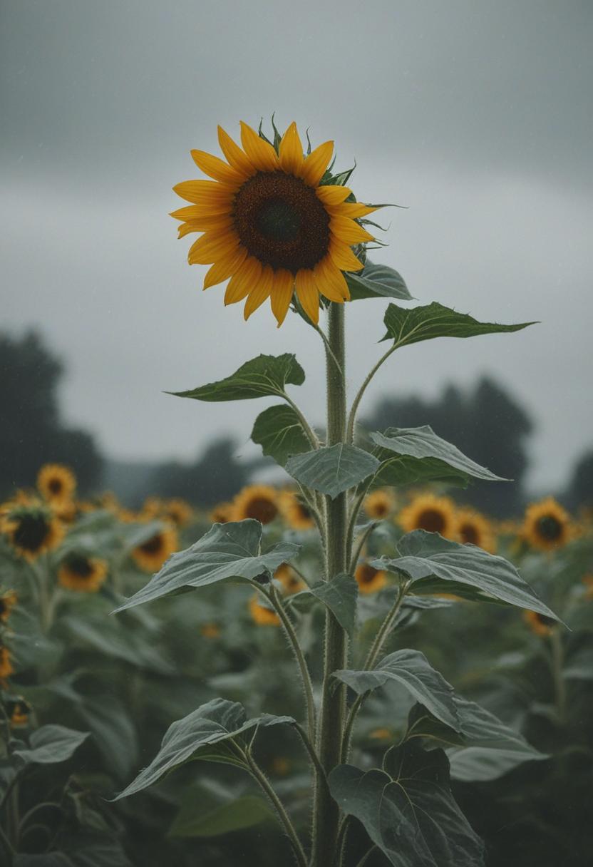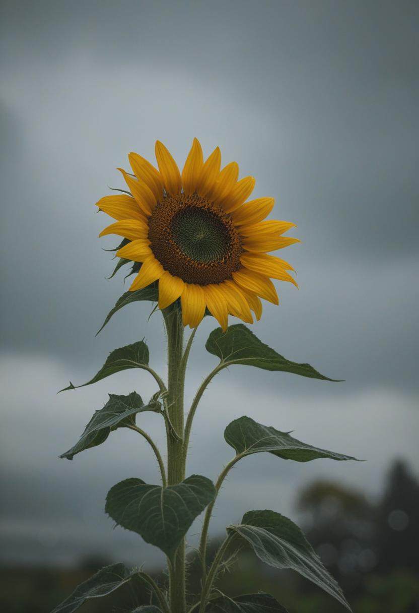 41. A calm studio shot features a sunflower in a cloudy, overcast setting, exuding a serene and peaceful sunflower aesthetic.