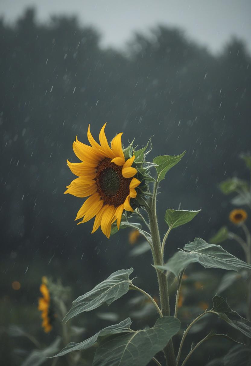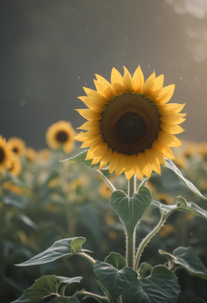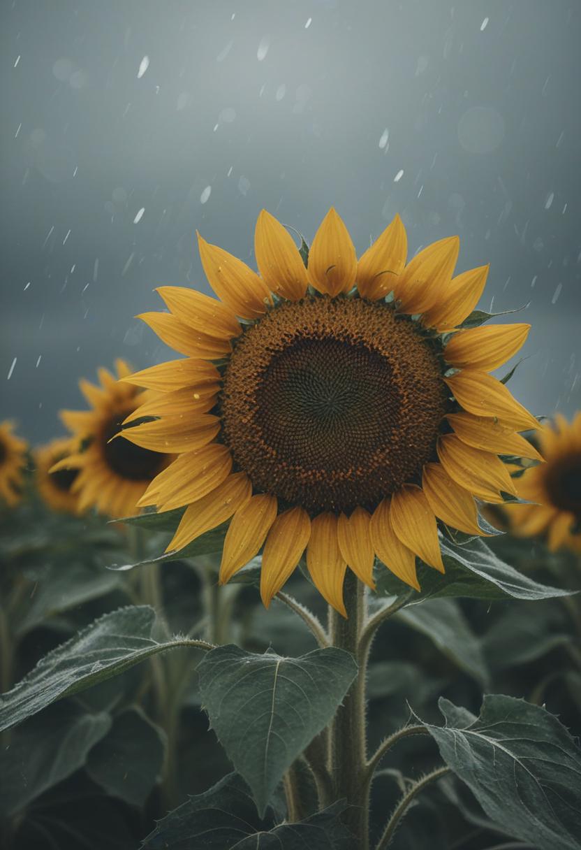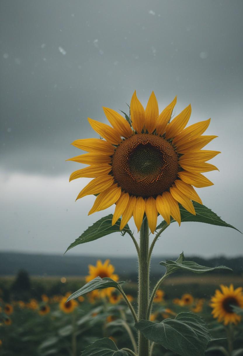 41. A calm studio shot features a sunflower in a cloudy, overcast setting, exuding a serene and peaceful sunflower aesthetic.