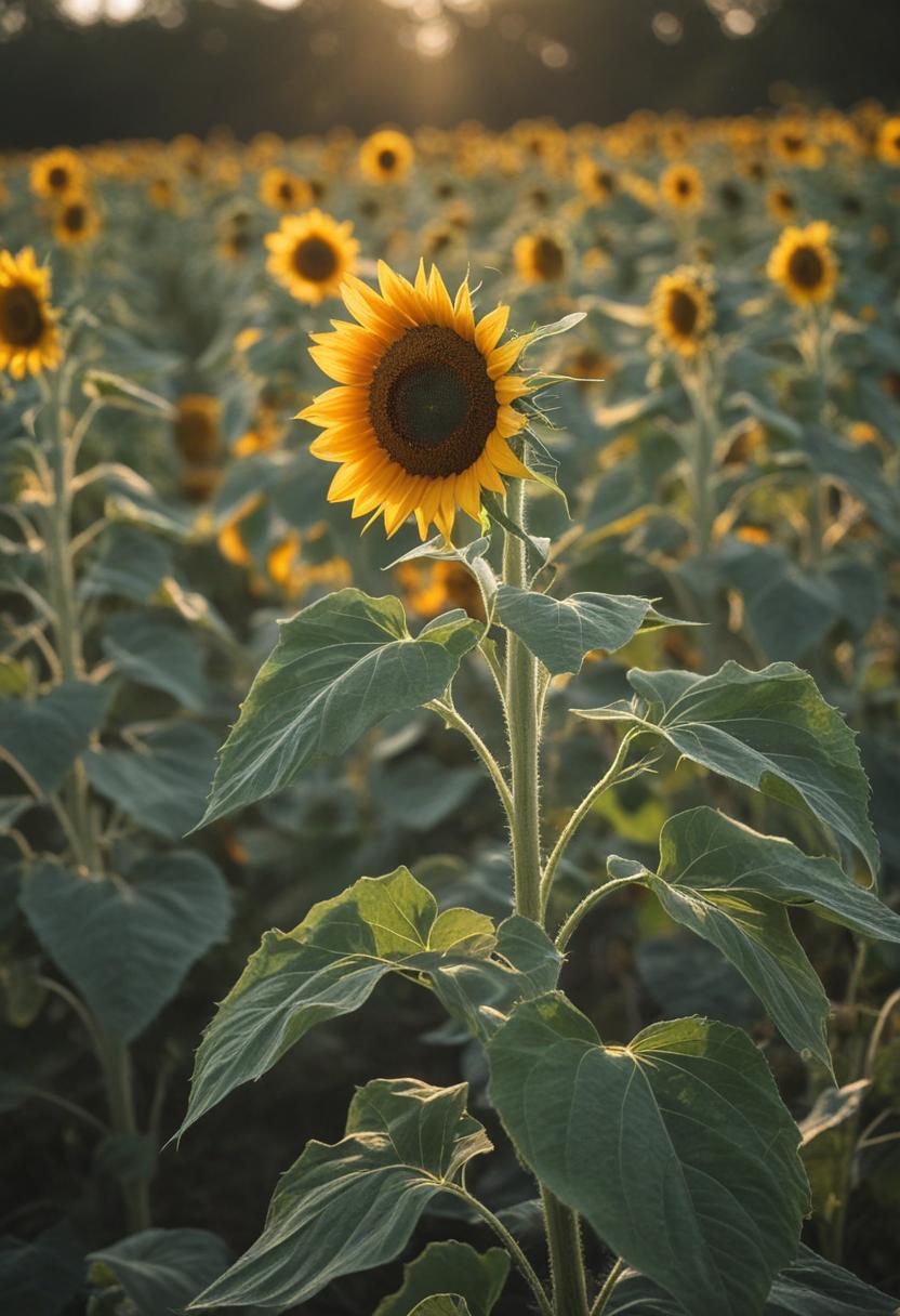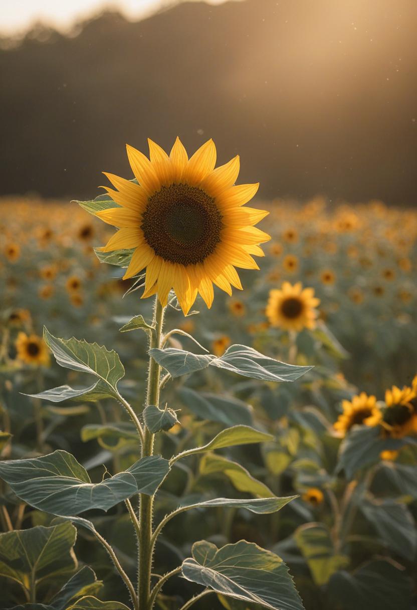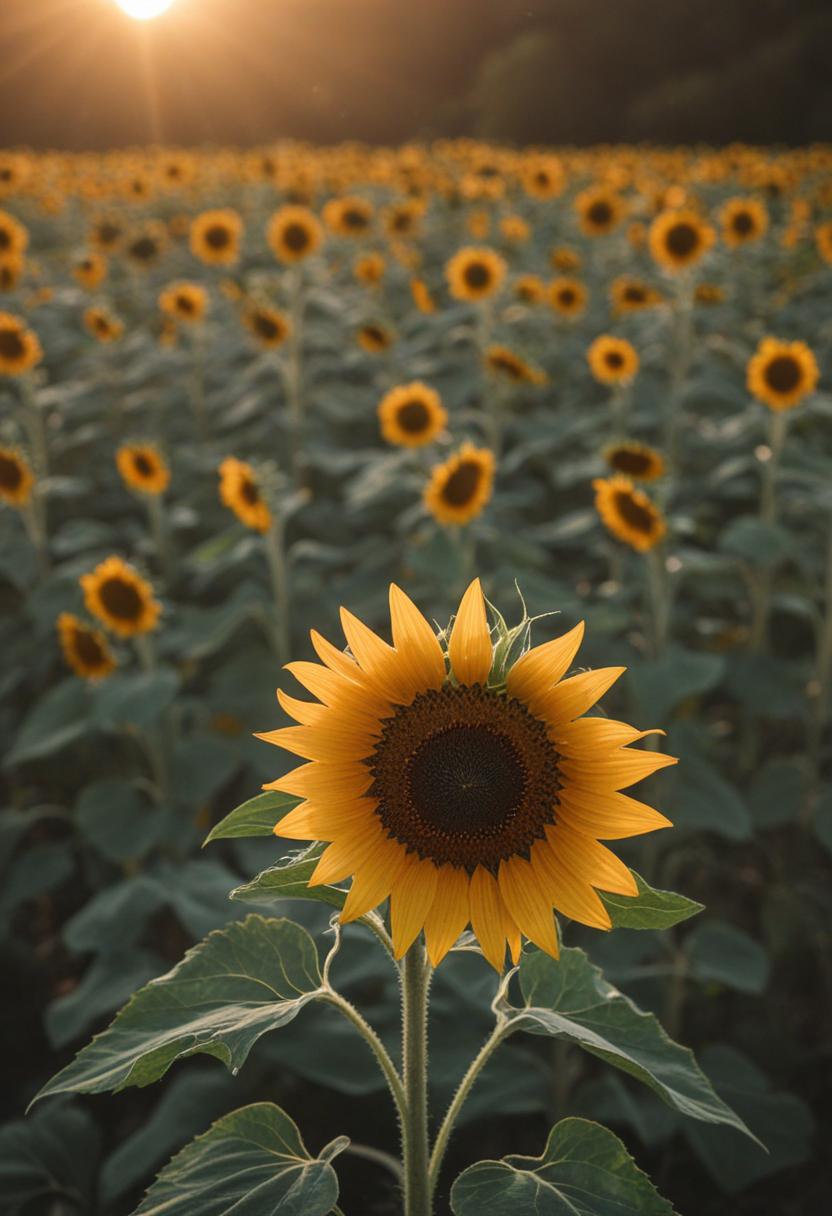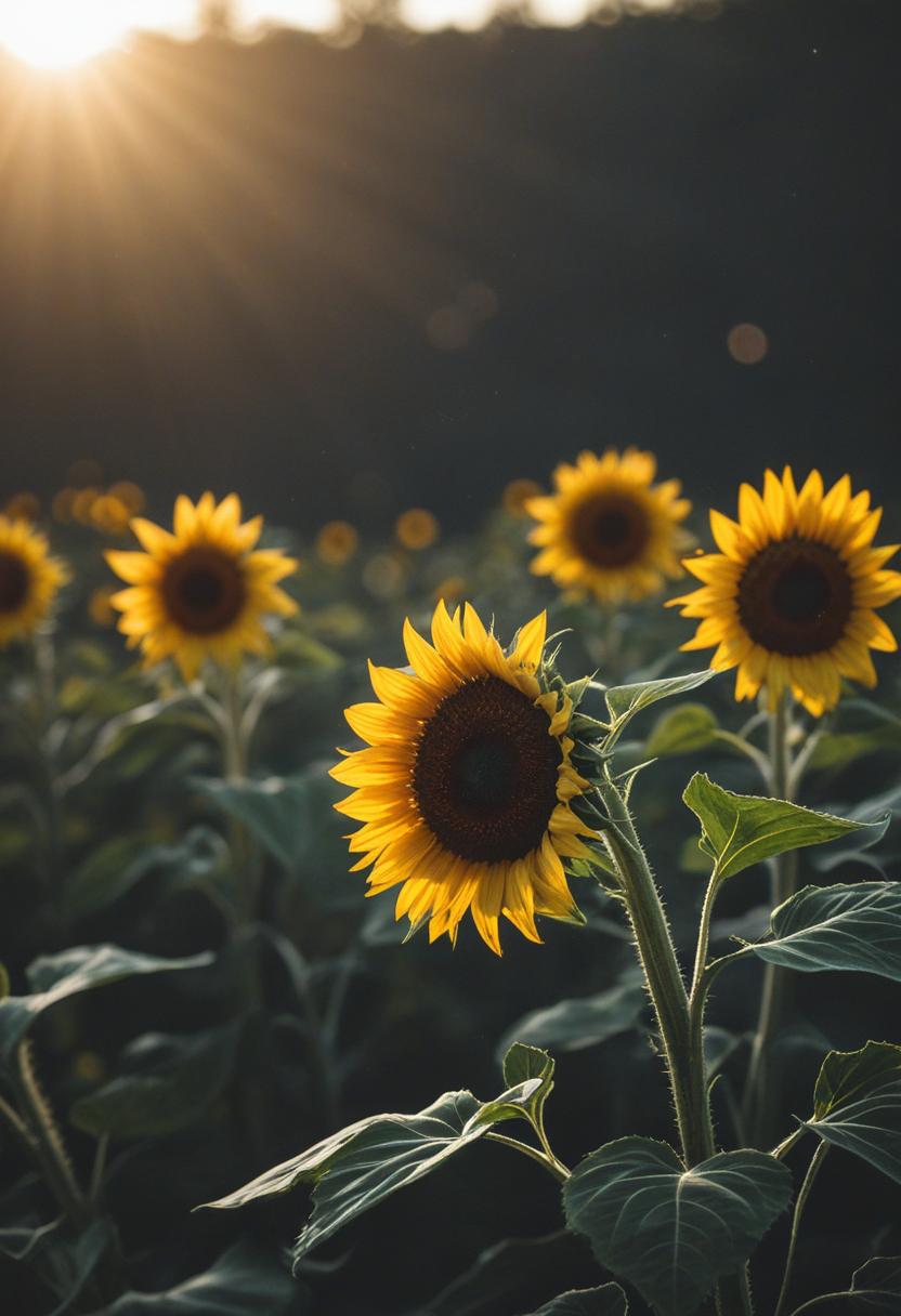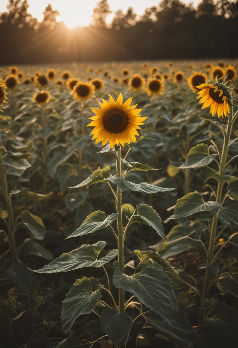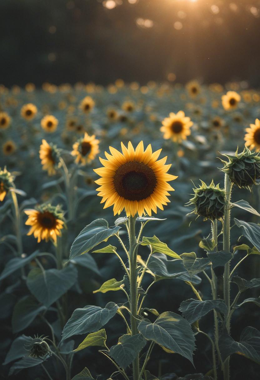 10. A sunflower field bathed in soft, dramatic backlighting, creating a glowing, scenic view with a warm and serene sunflower aesthetic.