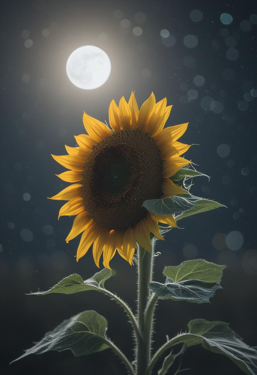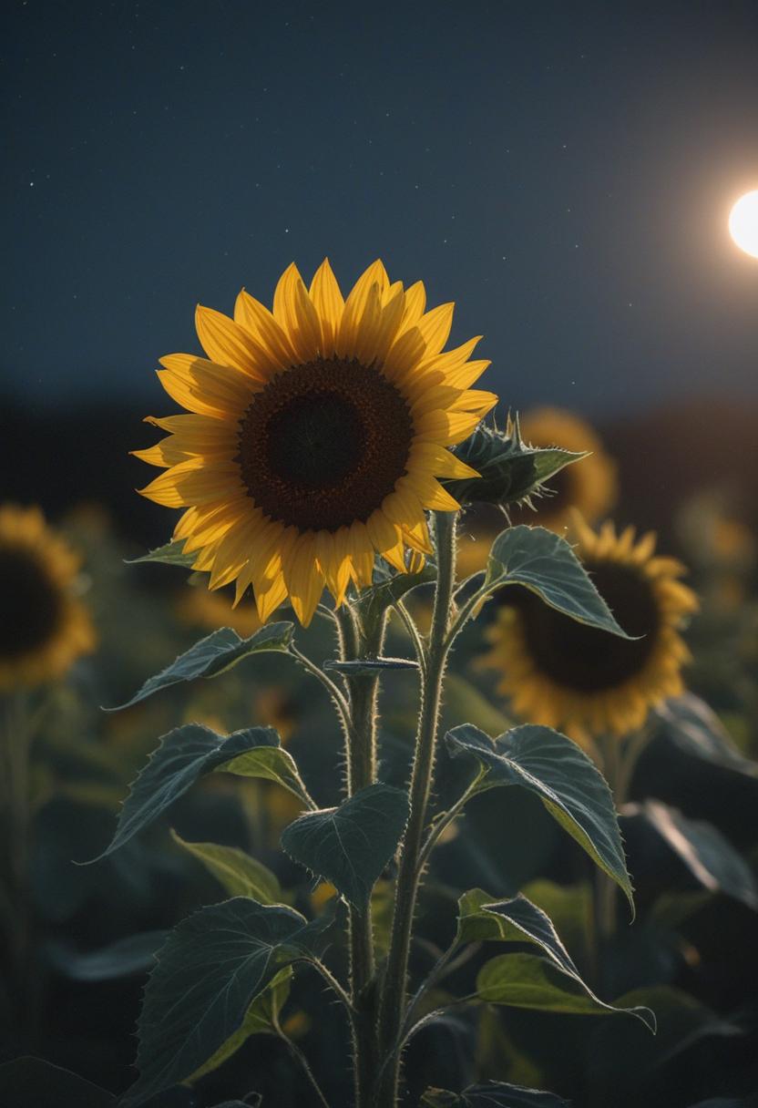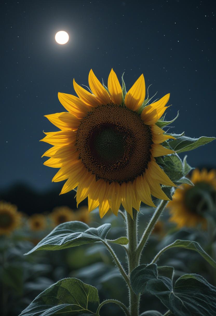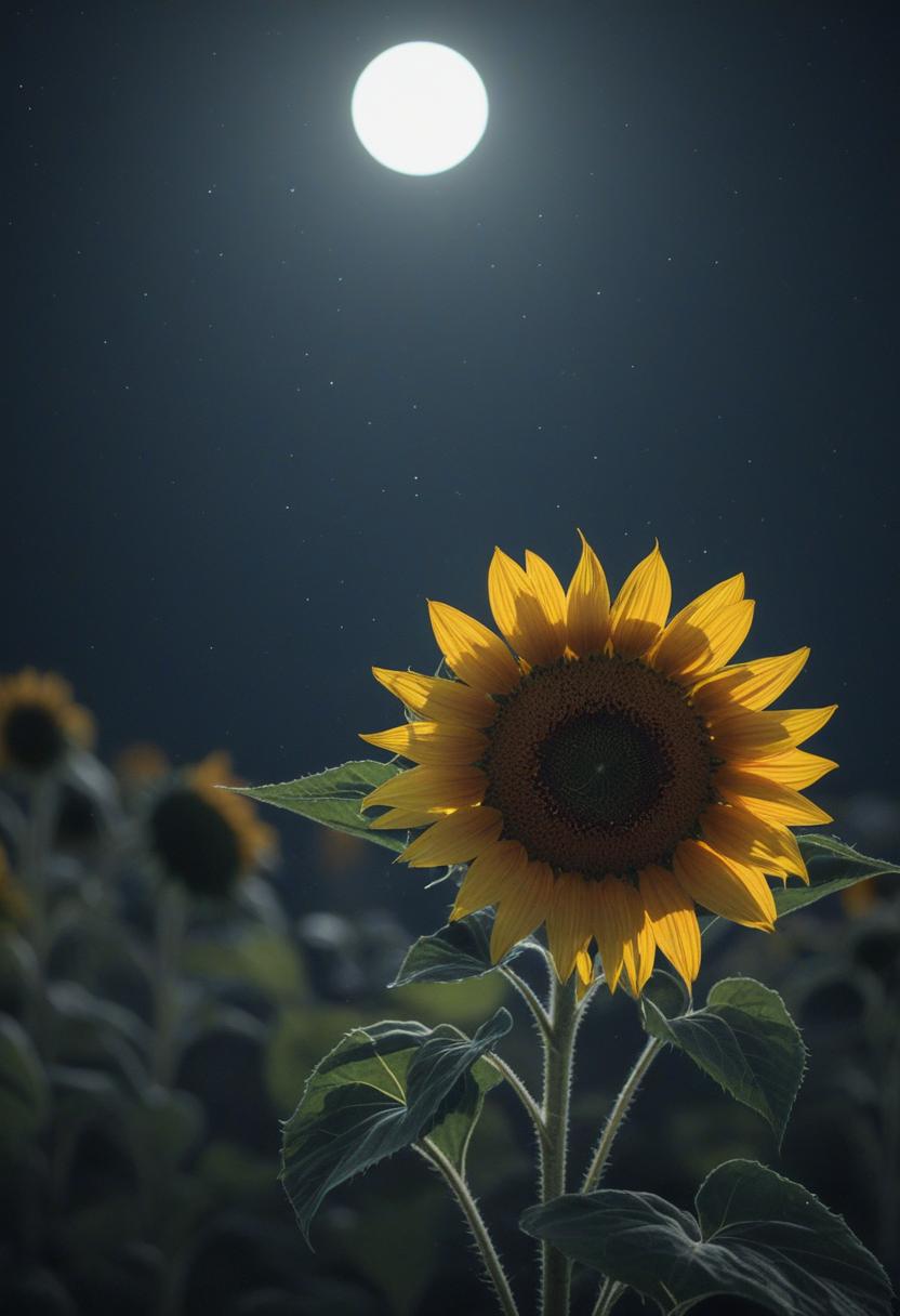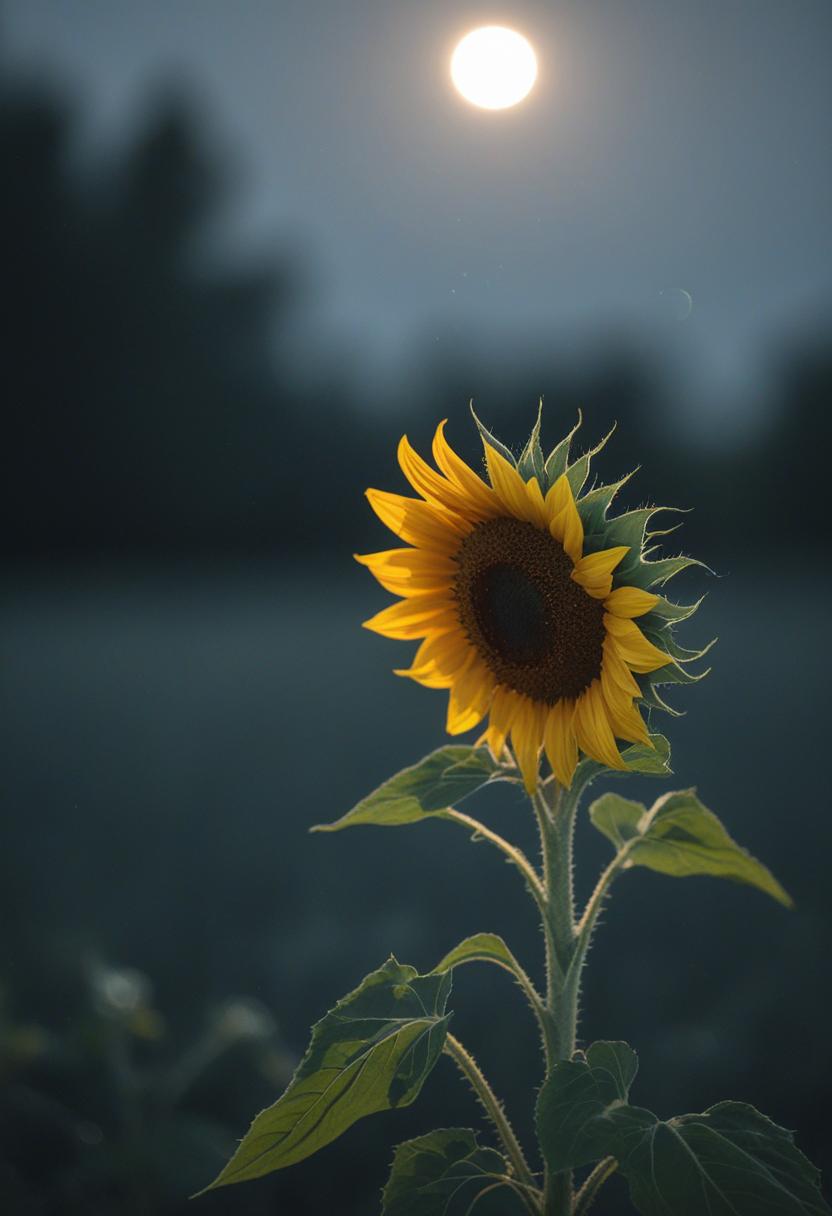 60. A sunflower stands under a glowing moon, bathed in soft moonlight, creating an enchanted, dreamy atmosphere with a side-view perspective.