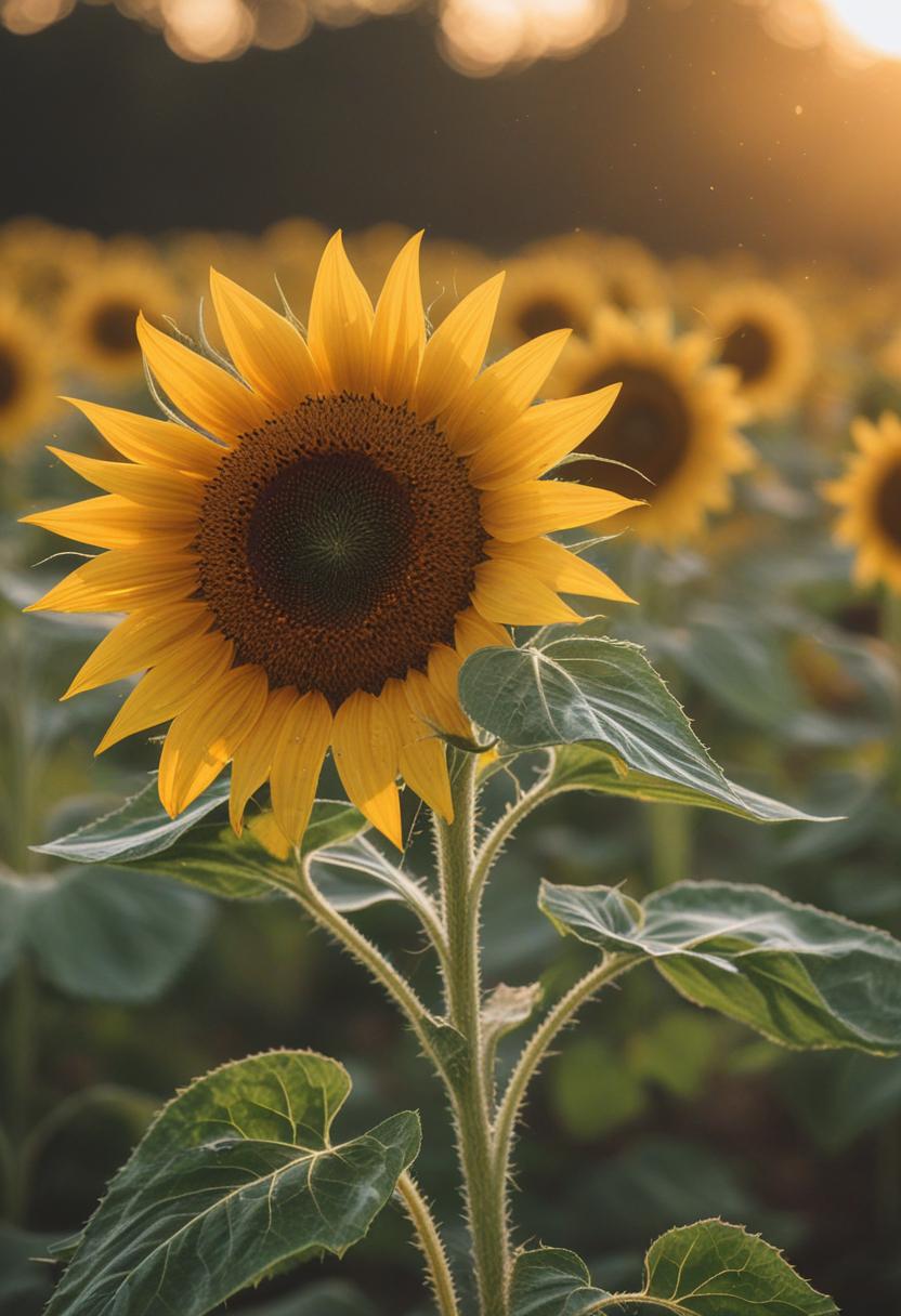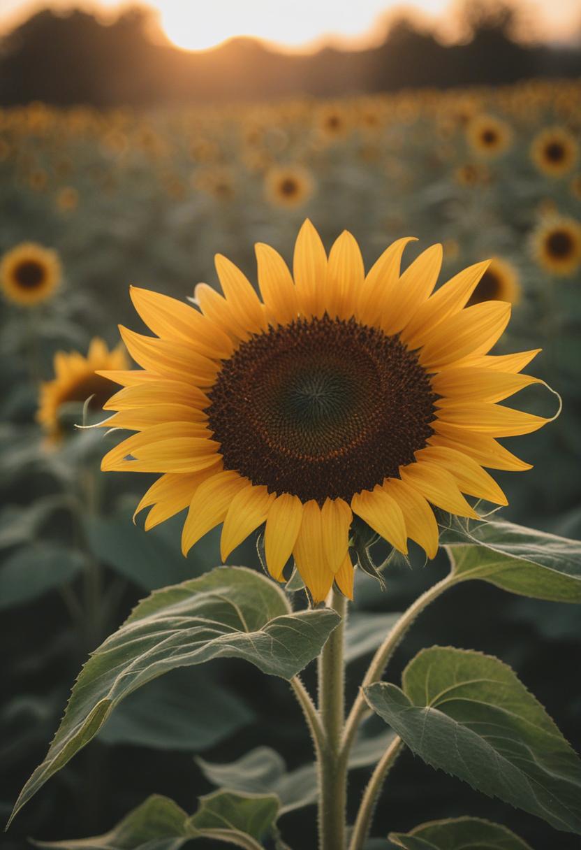 28. A romantic midshot of a sunflower field under a glowing sunset, capturing a serene and dreamy sunflower aesthetic with warm hues and soft light.