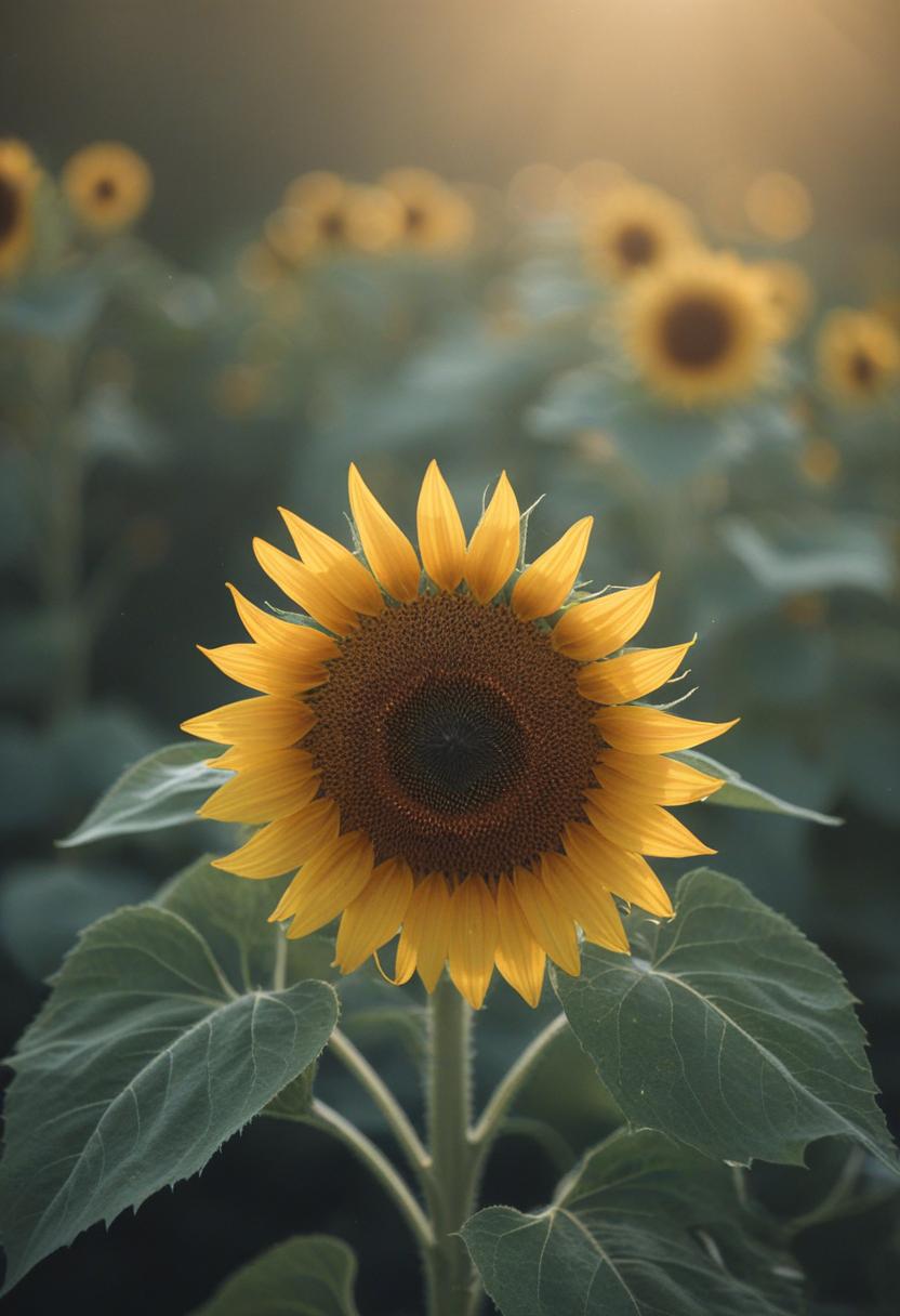 2. A sunflower bathed in soft, dramatic backlighting, creating a dreamy, ethereal midshot with a warm, golden glow.