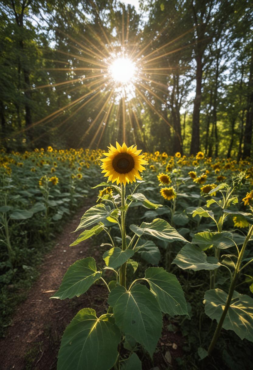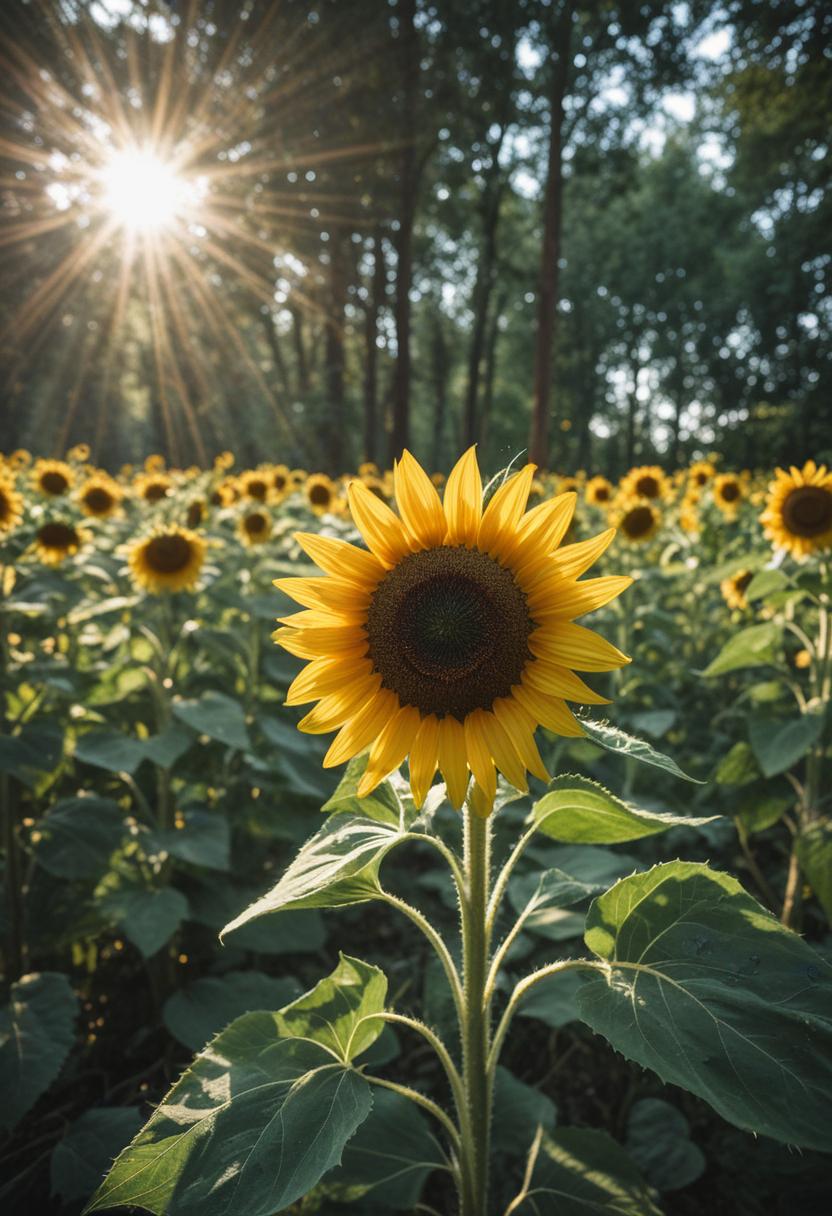 59. A sunflower fields bathed in dappled forest light, captured in a dreamy wide-angle shot, evoking a serene and vibrant natural beauty.