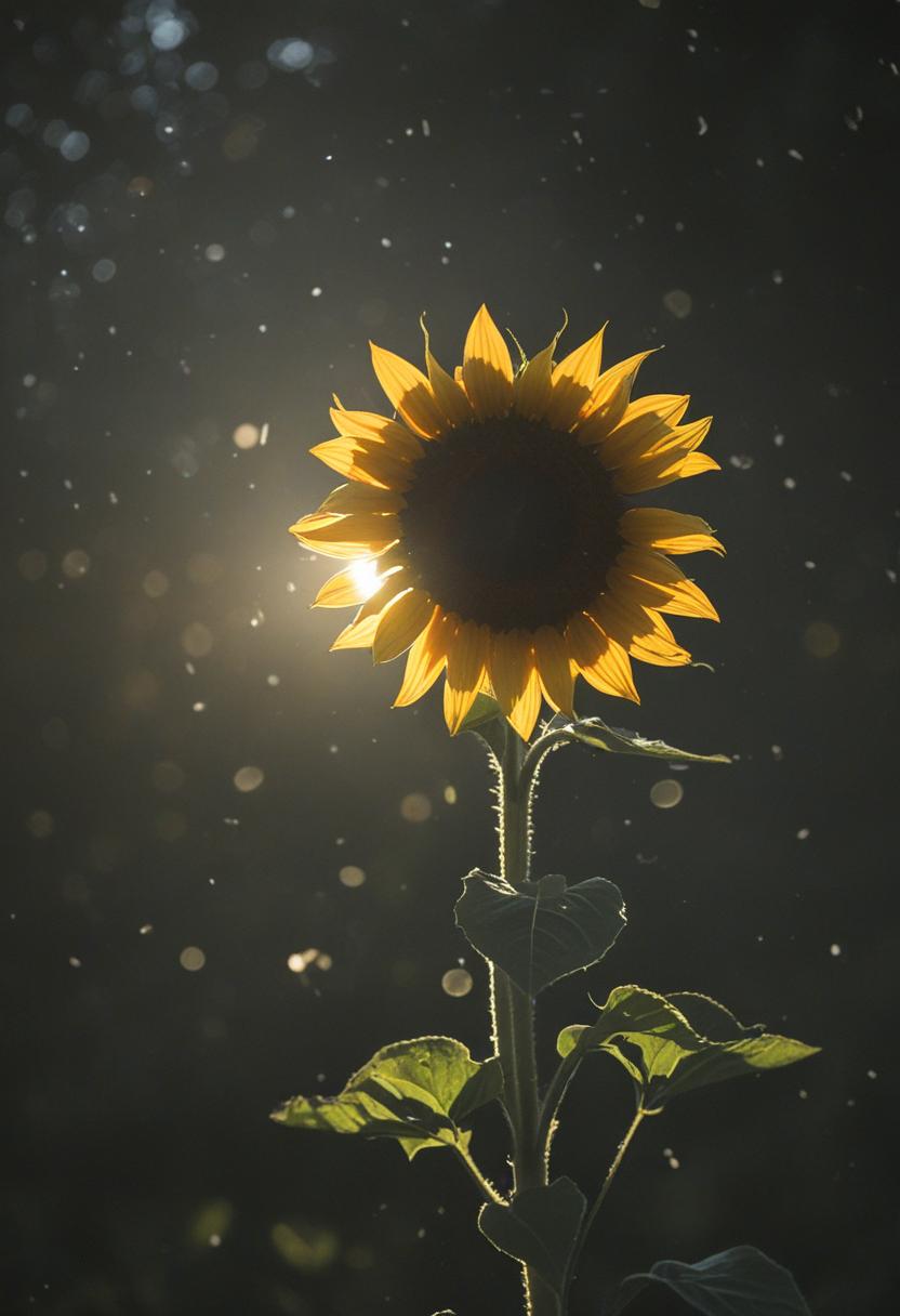 100. A sunflower blooms under dramatic backlighting, with a lively font and vibrant view, capturing a bold, artistic sunflower aesthetic.