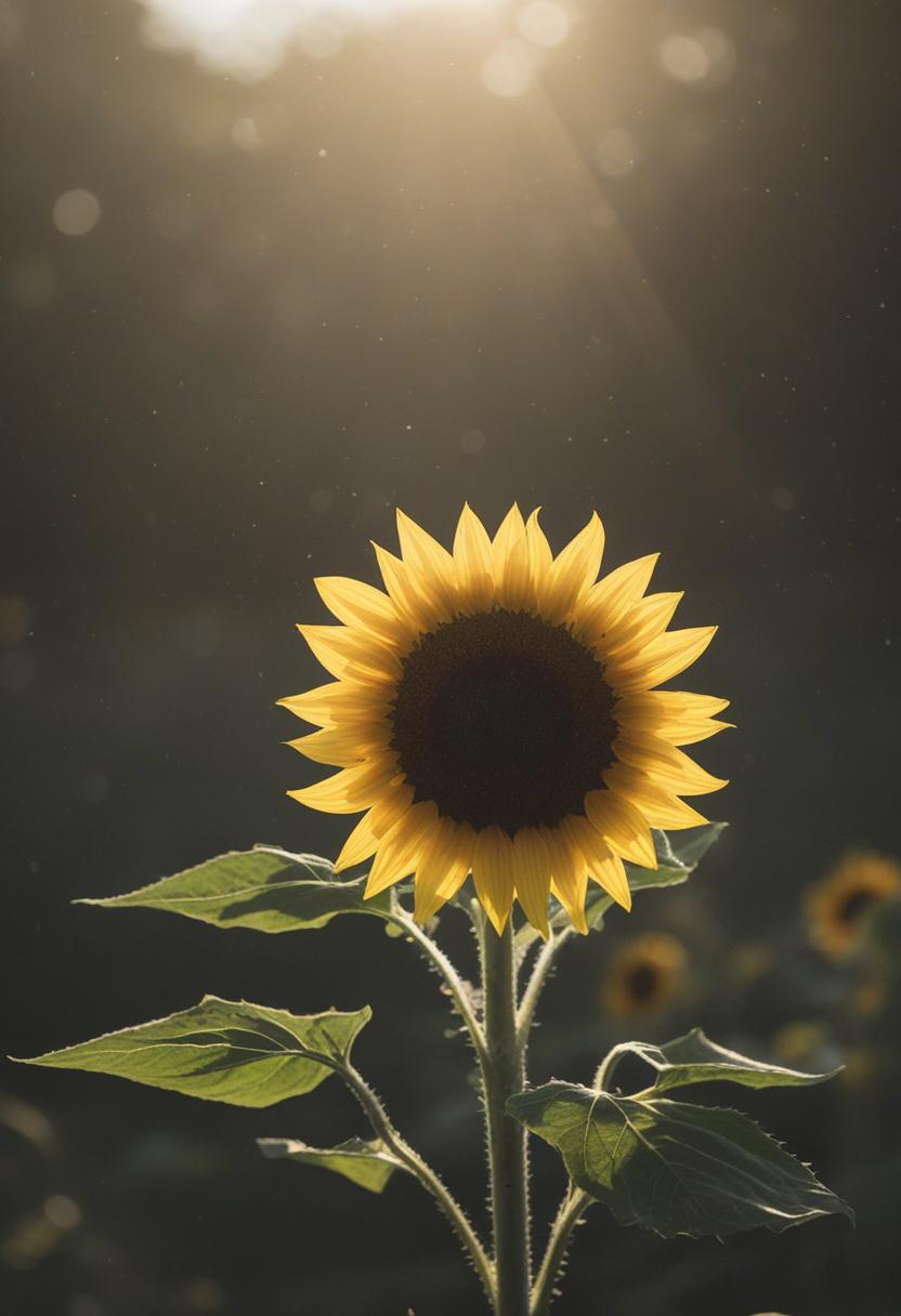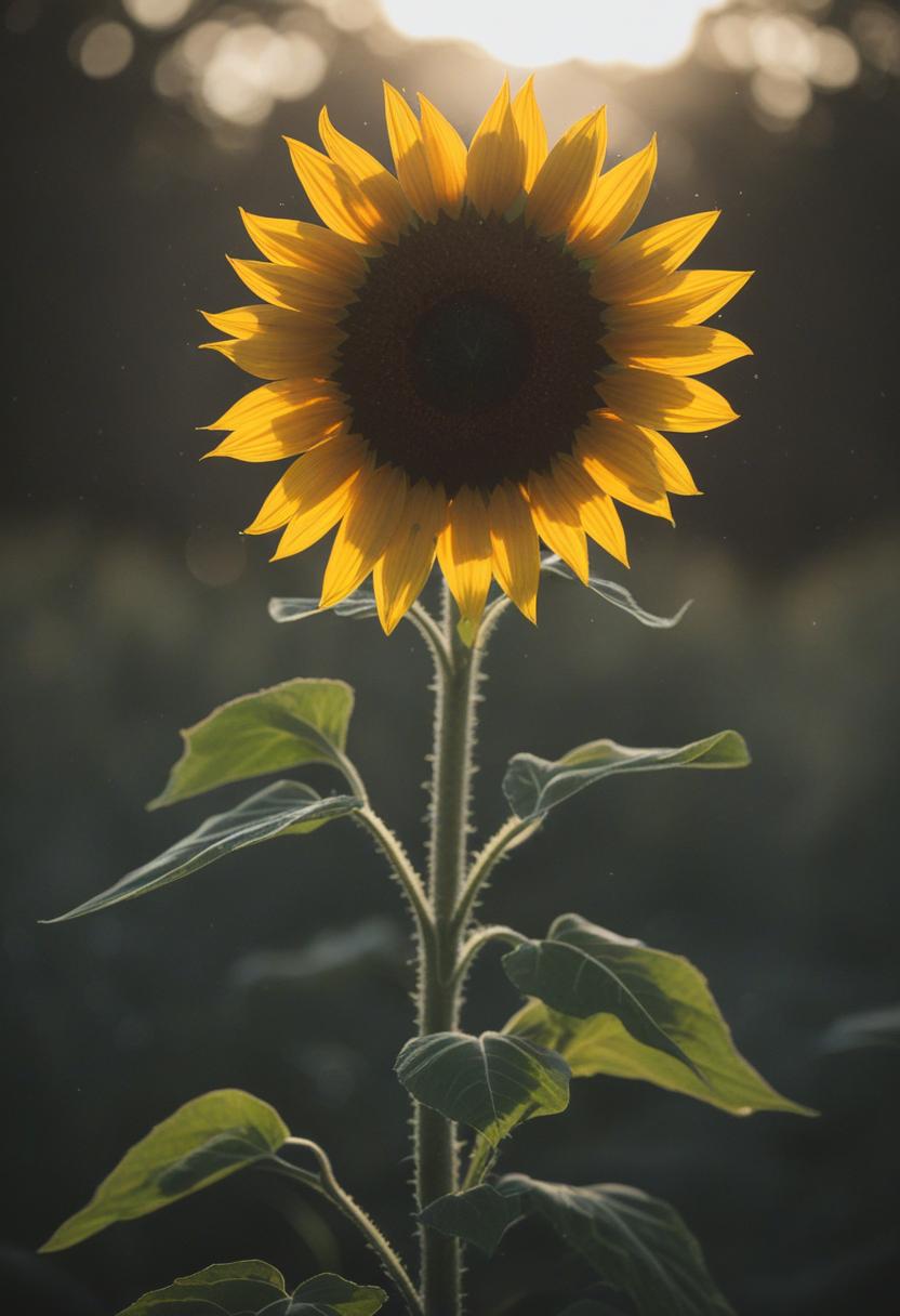 15. A sunflower bathed in dramatic backlighting, captured in an ethereal wide-angle shot, evoking a dreamlike, sunflower aesthetic.