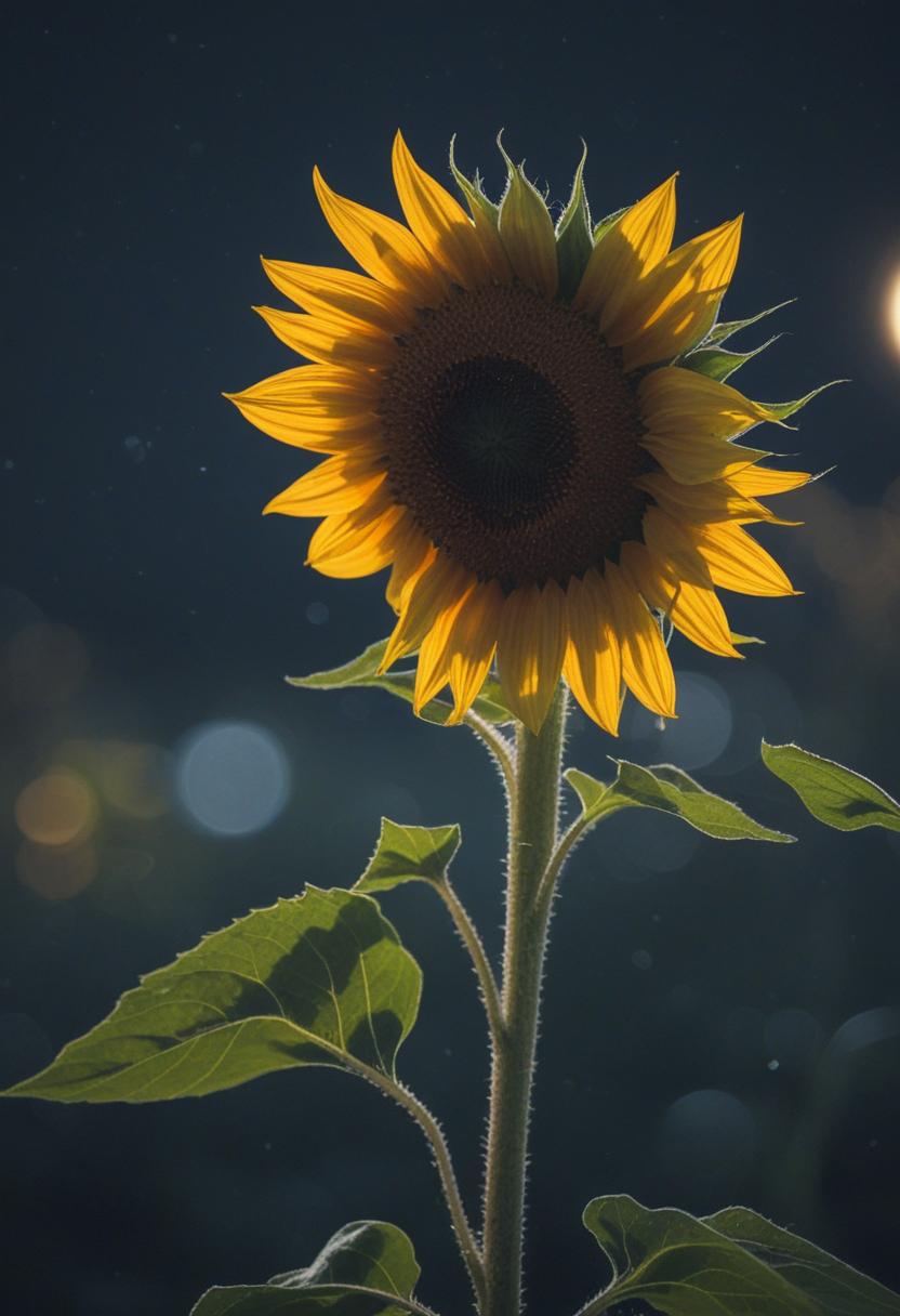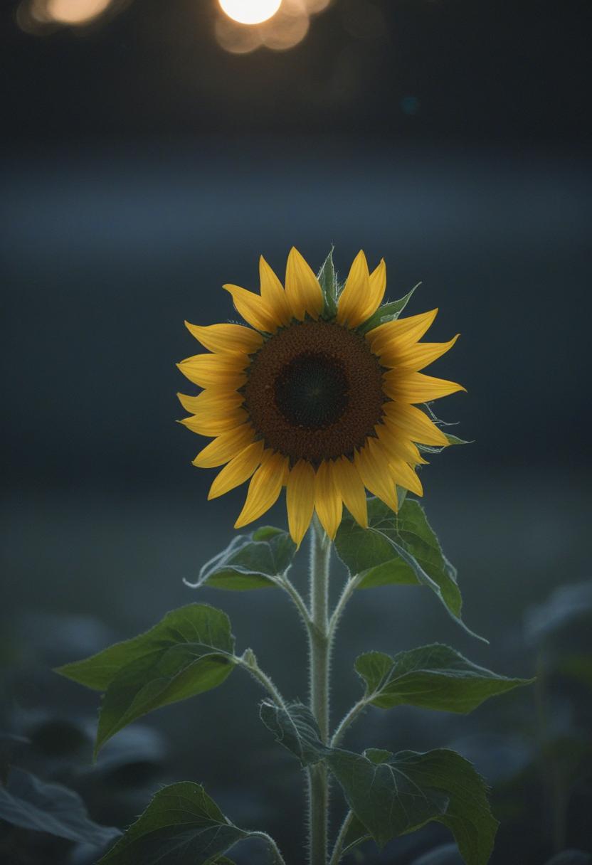 29. A serene studio scene features a sunflower under moonlight, exuding peace and a gentle, sunflower-inspired aesthetic.