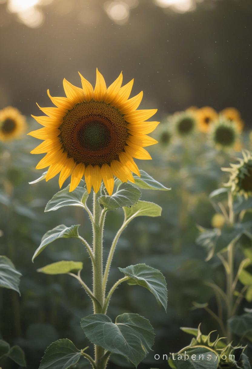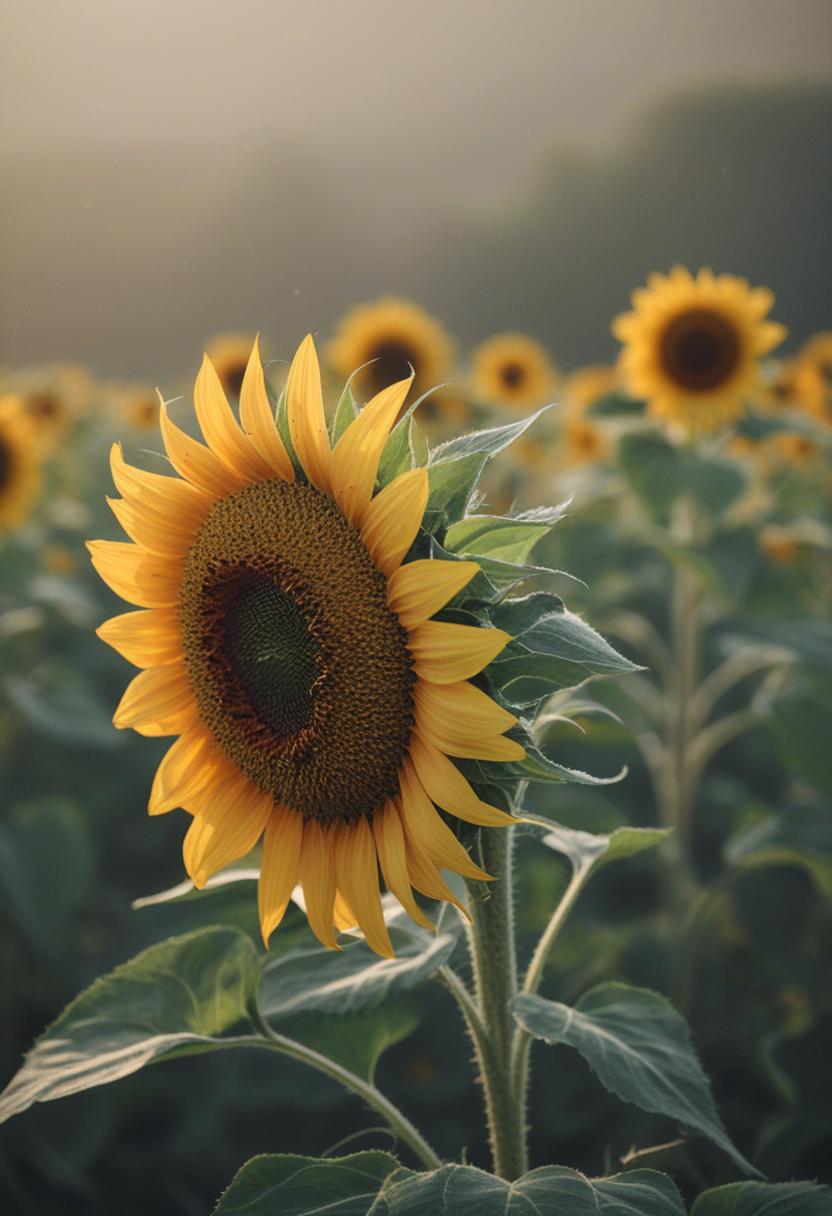 9. A soft morning light bathes a mysterious scenic view, featuring a sunflower in a serene, dreamy atmosphere.