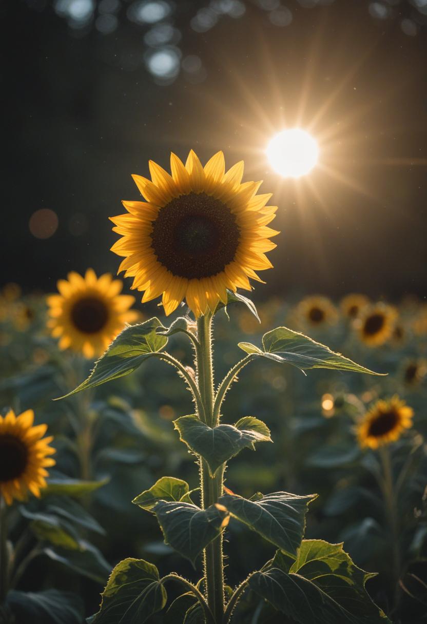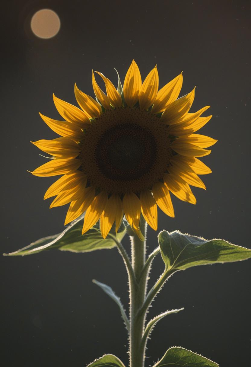 86. A wide-angle shot of a sunflower under dramatic backlighting, evoking a mysterious and ethereal sunflower aesthetic.