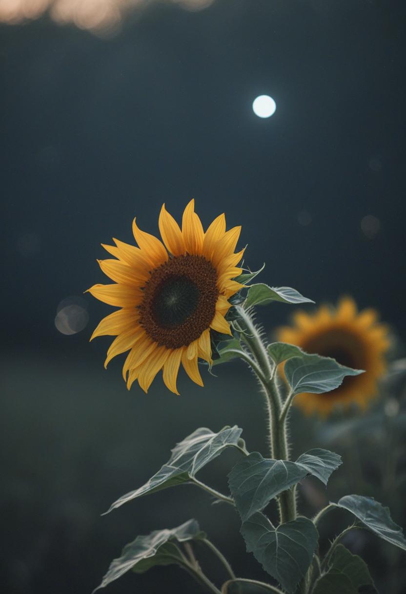 1. A serene midshot of a sunflower under moonlight, blending sunflower aesthetic with zen tranquility.