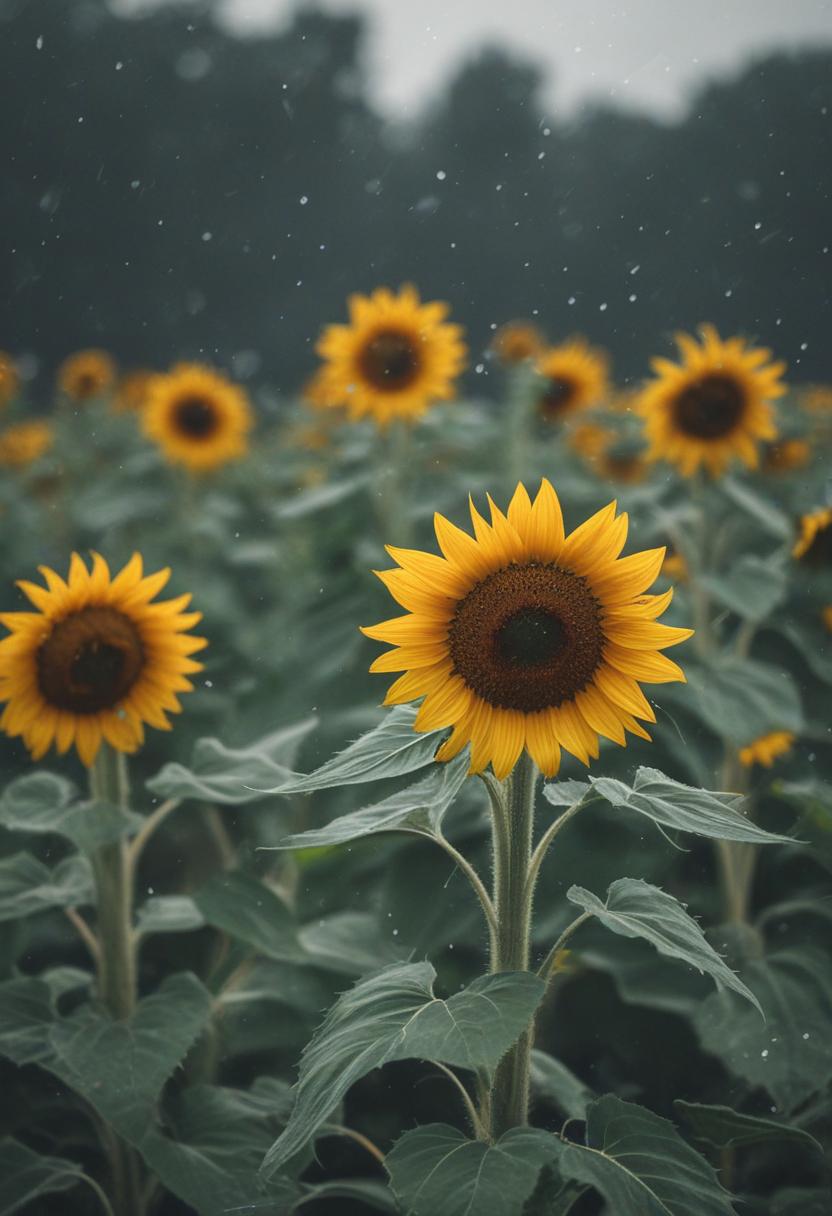 53. A sunflower field under cloudy, overcast skies creates a dreamy, scenic view with soft light and gentle hues, evoking a peaceful, whimsical atmosphere.