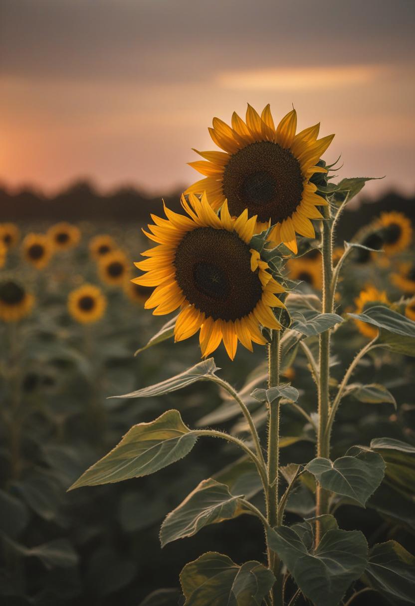 26. A sunflower field bathes in a golden sunset, creating a mysterious and scenic view with soft, glowing hues.