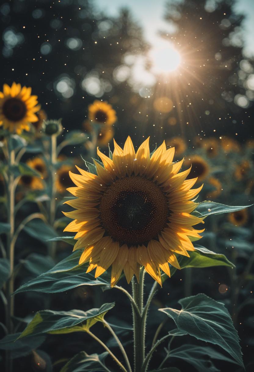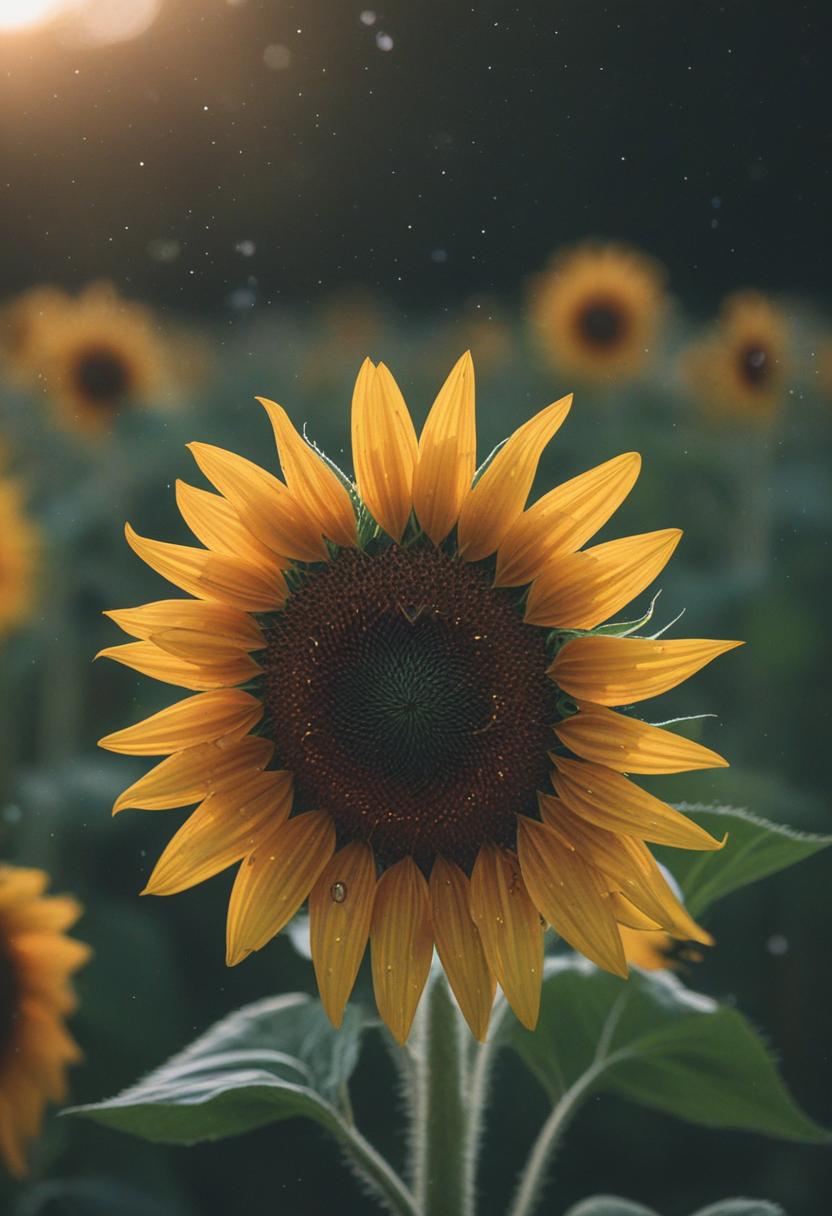 54. A sunflower in golden light, captured in a cinematic side view, evoking a dreamy, starry night aesthetic.